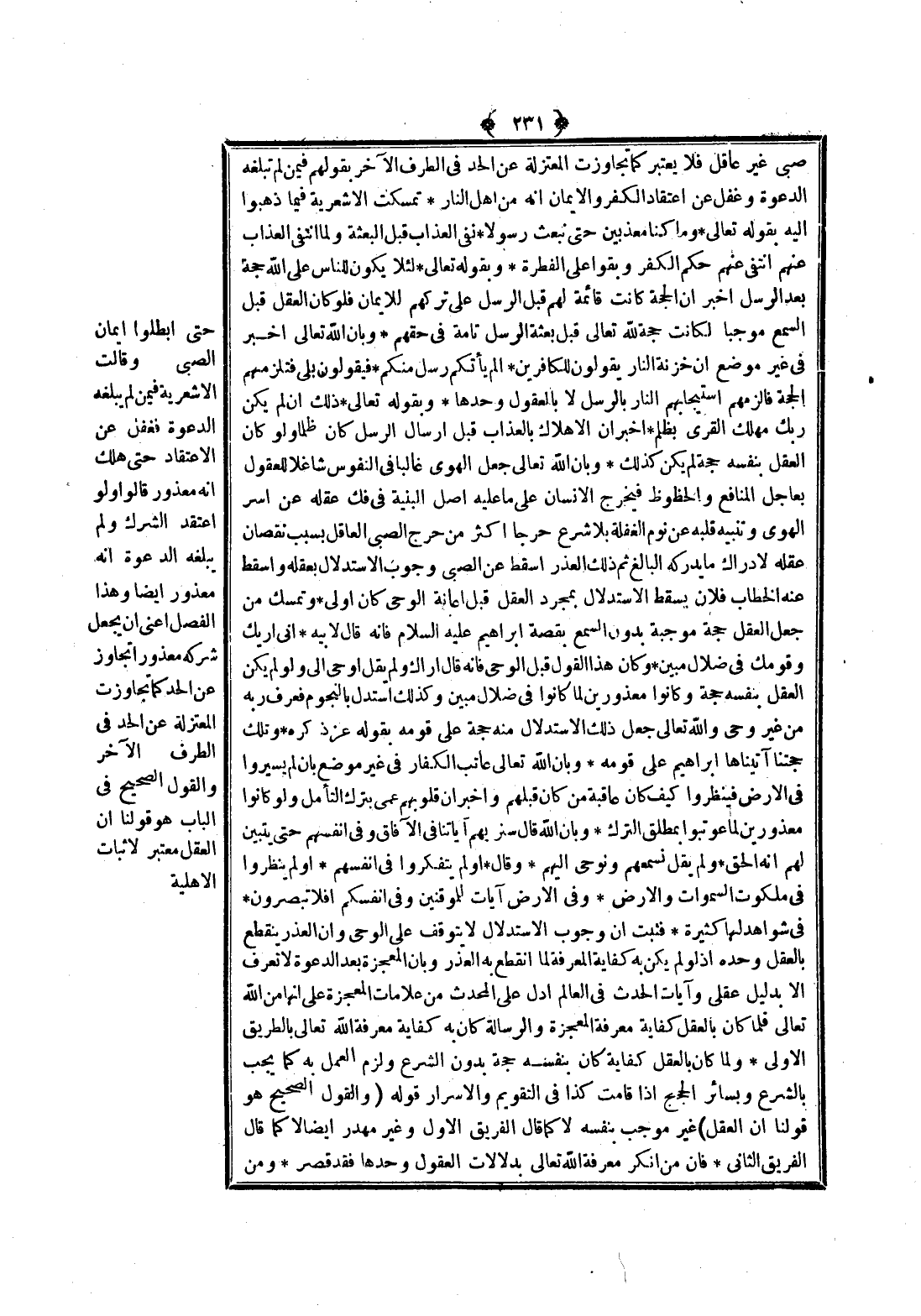 حَتَّى أَبْطَلُوا إيمَانَ الصَّبِيِّ وَقَالَتْ الْأَشْعَرِيَّةُ فِيمَنْ لَمْ تَبْلُغْهُ الدَّعْوَةُ فَغَفَلَ عَنْ الِاعْتِقَادِ حَتَّى هَلَكَ إنَّهُ مَعْذُورٌ قَالُوا وَلَوْ اعْتَقَدَ الشِّرْكَ وَلَمْ يَبْلُغْهُ الدَّعْوَةُ أَنَّهُ مَعْذُورٌ أَيْضًا وَهَذَا الْفَصْلُ أَعْنِي أَنْ يَجْعَلَ شِرْكَهُ مَعْذُورًا تَجَاوَزَ عَنْ الْحَدِّ كَمَا تَجَاوَزَتْ الْمُعْتَزِلَةُ عَنْ الْحَدِّ فِي الطَّرَفِ الْآخَرِ وَالْقَوْلُ الصَّحِيحُ فِي الْبَابِ هُوَ قَوْلُنَا إنَّ الْعَقْلَ مُعْتَبَرٌ لِإِثْبَاتِ الْأَهْلِيَّةِ