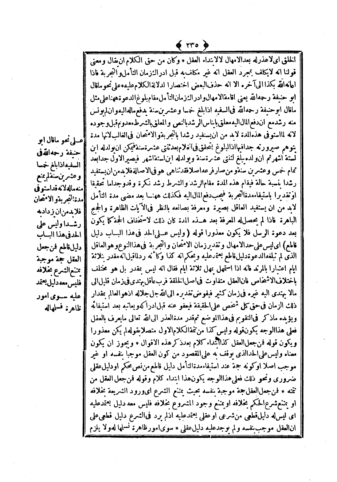 عَلَى نَحْوِ مَا قَالَ أَبُو حَنِيفَةَ - رَحِمَهُ اللَّهُ - فِي السَّفِيهِ إذَا بَلَغَ خَمْسًا وَعِشْرِينَ سَنَةً لَمْ يُمْنَعْ مِنْهُ مَالُهُ لِأَنَّهُ قَدْ اسْتَوْفَى مُدَّةَ التَّجْرِبَةِ وَالِامْتِحَانِ فَلَا بُدَّ مِنْ أَنْ يَزْدَادَ بِهِ رُشْدًا وَلَيْسَ عَلَى الْحَدِّ فِي هَذَا الْبَابِ دَلِيلٌ قَاطِعٌ فَمَنْ جَعَلَ الْعَقْلَ حُجَّةً مُوجِبَةً يَمْتَنِعُ الشَّرْعُ بِخِلَافِهِ فَلَيْسَ مَعَهُ دَلِيلٌ يَعْتَمِدُ عَلَيْهِ سِوَى أُمُورٍ ظَاهِرَةٍ فَسَلَّمَهَا لَهُ