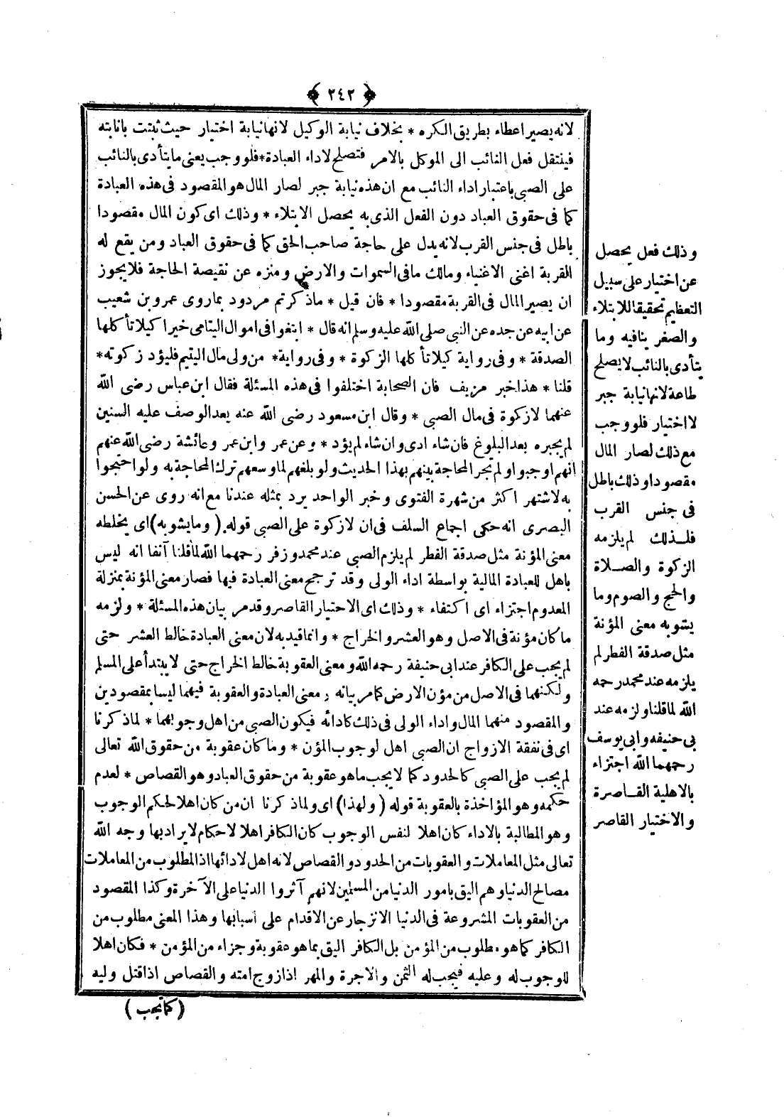 وَذَلِكَ أَيْ الِاخْتِيَارُ الْقَاصِرُ وَقَدْ مَرَّ بَيَانُ هَذِهِ الْمَسْأَلَةِ وَلَزِمَهُ مَا كَانَ مُؤْنَةً فِي الْأَصْلِ وَهُوَ الْعُشْرُ وَالْخَرَاجُ وَإِنَّمَا قَيَّدَ بِهِ لِأَنَّ مَعْنَى الْعِبَادَةِ خَالَطَ الْعُشْرَ حَتَّى لَمْ يَجِبْ عَلَى الْكَافِرِ عِنْدَ أَبِي حَنِيفَةَ - رَحِمَهُ اللَّهُ - وَمَعْنَى الْعُقُوبَةِ خَالَطَ الْخَرَاجَ حَتَّى لَا يَبْتَدِئَ عَلَى الْمُسْلِمِ وَلَكِنَّهُمَا فِي الْأَصْلِ مِنْ مُؤَنِ الْأَرْضِ كَمَا مَرَّ بَيَانُهُ وَمَعْنَى الْعِبَادَةِ وَالْعُقُوبَةِ فِيهِمَا لَيْسَا بِمَقْصُودَيْنِ وَالْمَقْصُودُ مِنْهُمَا الْمَالُ وَأَدَاءُ الْوَلِيِّ فِي ذَلِكَ كَأَدَائِهِ فَيَكُونُ الصَّبِيُّ مِنْ أَهْلِ وُجُوبِهِمَا وَلِمَا ذَكَرْنَا أَيْ فِي نَفَقَةِ الْأَزْوَاجِ أَنَّ الصَّبِيَّ أَهْلٌ لِوُجُوبِ الْمُؤَنِ وَمَا كَانَ عُقُوبَةً مِنْ حُقُوقِ اللَّهِ تَعَالَى لَمْ يَجِبْ عَلَى الصَّبِيِّ كَالْحُدُودِ كَمَا لَا يَجِبُ مَا هُوَ عُقُوبَةٌ مِنْ حُقُوقِ الْعِبَادِ وَهُوَ الْقِصَاصُ لِعَدَمِ حُكْمِهِ وَهُوَ الْمُؤَاخِذُ بِالْعُقُوبَةِ.