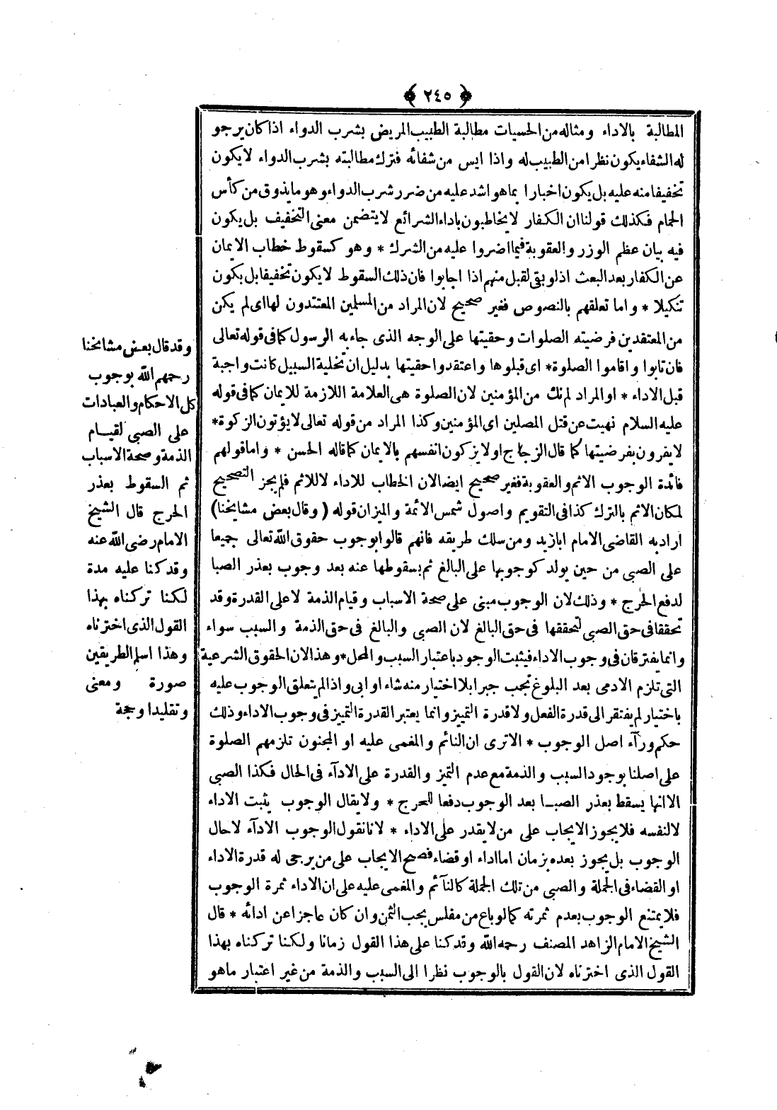 وَقَدْ قَالَ بَعْضُ مَشَايِخِنَا - رَحِمَهُمُ اللَّهُ - بِوُجُوبِ كُلِّ الْأَحْكَامِ وَالْعِبَادَاتِ عَلَى الصَّبِيِّ لِقِيَامِ الذِّمَّةِ وَصِحَّةِ الْأَسْبَابِ ثُمَّ السُّقُوطُ بِعُذْرِ الْحَرَجِ قَالَ الشَّيْخُ الْإِمَامُ - رَضِيَ اللَّهُ عَنْهُ - وَقَدْ كُنَّا عَلَيْهِ مُدَّةً لَكِنَّا تَرَكْنَاهُ بِهَذَا الْقَوْلِ الَّذِي اخْتَرْنَاهُ وَهَذَا أَسْلَمُ الطَّرِيقَيْنِ صُورَةً وَمَعْنًى وَتَقْلِيدًا وَحُجَّةً