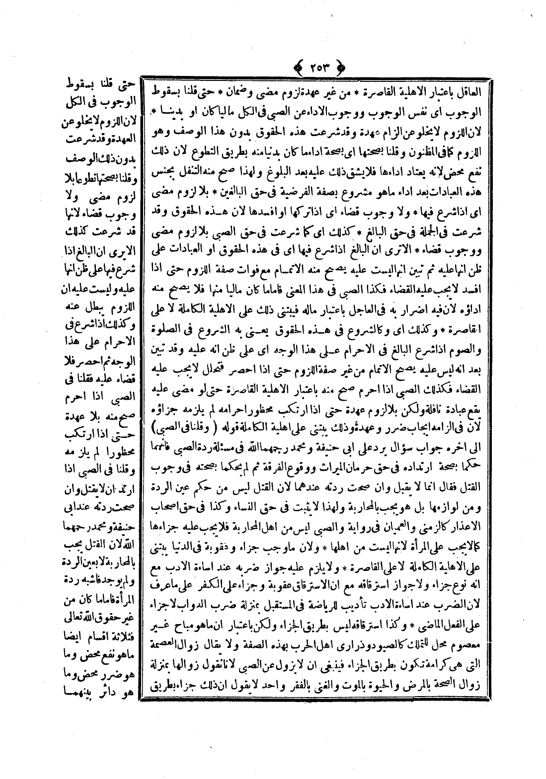 أَلَا تَرَى أَنَّ الْبَالِغَ إذَا شَرَعَ فِيهَا أَيْ فِي هَذِهِ الْحُقُوقِ أَوْ الْعِبَادَاتِ عَلَى ظَنِّ أَنَّهَا عَلَيْهِ ثُمَّ تَبَيَّنَ أَنَّهَا لَيْسَتْ عَلَيْهِ يَصِحُّ مِنْهُ الْإِتْمَامُ مَعَ فَوَاتِ صِفَةِ اللُّزُومِ حَتَّى إذَا أَفْسَدَ لَا يَجِبُ عَلَيْهِ الْقَضَاءُ فَكَذَا الصَّبِيُّ فِي هَذَا الْمَعْنَى فَأَمَّا مَا كَانَ مَالِيًّا مِنْهَا فَلَا يَصِحُّ مِنْهُ أَدَاؤُهُ لِأَنَّ فِيهِ إضْرَارًا بِهِ فِي الْعَاجِلِ بِاعْتِبَارِ مَالِهِ فَيَبْتَنِي ذَلِكَ عَلَى الْأَهْلِيَّةِ الْكَامِلَةِ لَا عَلَى الْقَاصِرَةِ وَكَذَلِكَ أَيْ وَكَالشُّرُوعِ فِي هَذِهِ الْحُقُوقِ يَعْنِي بِهِ الشُّرُوعَ فِي الصَّلَاةِ وَالصَّوْمِ إذَا شَرَعَ الْبَالِغُ فِي الْإِحْرَامِ عَلَى هَذَا الْوَجْهِ أَيْ عَلَى ظَنِّ أَنَّهُ عَلَيْهِ وَقَدْ تَبَيَّنَ بَعْدُ أَنَّهُ لَيْسَ عَلَيْهِ يَصِحُّ الْإِتْمَامُ مِنْ غَيْرِ صِفَةِ اللُّزُومِ حَتَّى إذَا أُحْصِرَ فَتَحَلَّلَ لَا يَجِبُ عَلَيْهِ الْقَضَاءُ فَكَذَلِكَ الصَّبِيُّ إذَا أَحْرَمَ صَحَّ مِنْهُ بِاعْتِبَارِ الْأَهْلِيَّةِ الْقَاصِرَةِ حَتَّى لَوْ مَضَى عَلَيْهِ يَقَعُ عِبَادَةً نَافِلَةً وَلَكِنْ بِلَا لُزُومِ عُهْدَةٍ حَتَّى إذَا ارْتَكَبَ مَحْظُورَ إحْرَامِهِ لَمْ يَلْزَمْهُ جَزَاؤُهُ لِأَنَّ فِي إلْزَامِهِ إيجَابَ ضَرَرٍ وَعُهْدَةٍ وَذَلِكَ يُبْتَنَى عَلَى الْأَهْلِيَّةِ الْكَامِلَةِ قَوْلُهُ (وَقُلْنَا فِي الصَّبِيِّ) إلَى آخِرِهِ جَوَابُ سُؤَالٍ يَرِدُ عَلَى أَبِي حَنِيفَةَ وَمُحَمَّدٍ رَحِمَهُمَا اللَّهُ فِي مَسْأَلَةِ رِدَّةِ الصَّبِيِّ فَإِنَّهُمَا حَكَمَا بِصِحَّةِ ارْتِدَادِهِ فِي حَقِّ حِرْمَانِ الْمِيرَاثِ وَوُقُوعِ الْفُرْقَةِ ثُمَّ لَمْ يَحْكُمَا بِصِحَّتِهِ فِي وُجُوبِ الْقَتْلِ فَقَالَ إنَّمَا لَا يُقْتَلُ وَإِنْ صَحَّتْ رِدَّتُهُ عِنْدَهُمَا لِأَنَّ الْقَتْلَ لَيْسَ مِنْ حُكْمِ عَيْنِ الرِّدَّةِ وَمِنْ لَوَازِمِهَا بَلْ هُوَ يَجِبُ بِالْمُحَارَبَةِ وَلِهَذَا لَا يَثْبُتُ فِي حَقِّ النِّسَاءِ وَكَذَا فِي حَقِّ أَصْحَابِ الْأَعْذَارِ كَالزَّمْنَى وَالْعُمْيَانِ فِي رِوَايَةٍ وَالصَّبِيُّ لَيْسَ مِنْ أَهْلِ الْمُحَارَبَةِ فَلَا يَجِبُ عَلَيْهِ جَزَاؤُهَا كَمَا لَا يَجِبُ عَلَى الْمَرْأَةِ لِأَنَّهَا لَيْسَتْ مِنْ أَهْلِهَا وَلِأَنَّ مَا وَجَبَ جَزَاءً وَعُقُوبَةً فِي الدُّنْيَا يُبْتَنَى عَلَى الْأَهْلِيَّةِ الْكَامِلَةِ لَا عَلَى الْقَاصِرَةِ.