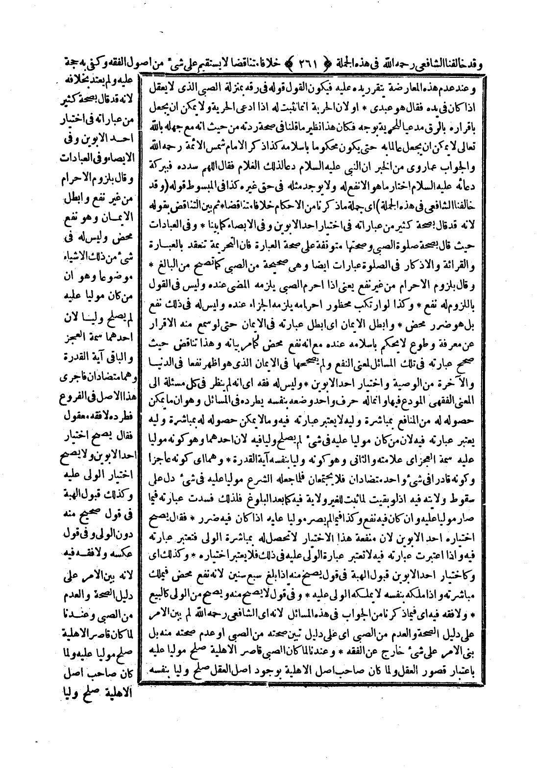 وَقَدْ خَالَفَنَا الشَّافِعِيُّ - رَحِمَهُ اللَّهُ - فِي هَذِهِ الْجُمْلَةِ خِلَافًا مُتَنَاقِضًا لَا يَسْتَقِيمُ عَلَى شَيْءٍ مِنْ أُصُولِ الْفِقْهِ وَكَفَى بِهِ حُجَّةً عَلَيْهِ وَلَمْ يُعْتَدَّ بِخِلَافِهِ لِأَنَّهُ قَدْ قَالَ بِصِحَّةِ كَثِيرٍ مِنْ عِبَارَاتِهِ فِي اخْتِيَارِ أَحَدِ الْأَبَوَيْنِ وَفِي الْإِيصَاءِ وَفِي الْعِبَادَاتِ وَقَالَ بِلُزُومِ الْإِحْرَامِ مِنْ غَيْرِ نَفْعٍ وَأَبْطَلَ الْإِيمَانَ وَهُوَ نَفْعٌ مَحْضٌ وَلَيْسَ لَهُ فِي شَيْءٍ مِنْ ذَلِكَ الْأَشْيَاءِ مَوْضُوعًا، وَهُوَ أَنَّ مَنْ كَانَ مُولَيًا عَلَيْهِ لَمْ يَصْلُحْ وَلِيًّا لِأَنَّ أَحَدَهُمَا سِمَةُ الْعَجْزِ وَالْبَاقِيَ آيَةُ الْقُدْرَةِ وَهُمَا مُتَضَادَّانِ فَأَجْرَى هَذَا الْأَصْلُ فِي الْفُرُوعِ فَطَرَدَهُ لِأَفْقَهِ مَعْقُولٍ فَقَالَ يَصِحُّ اخْتِيَارُ أَحَدِ الْأَبَوَيْنِ وَلَا يَصِحُّ اخْتِيَارُ الْوَلِيِّ عَلَيْهِ، وَكَذَلِكَ قَبُولُ الْهِبَةِ فِي قَوْلٍ صَحِيحٌ مِنْهُ دُونَ الْوَلِيِّ وَفِي قَوْلٍ عَكْسُهُ وَلَا فِقْهَ فِيهِ لِأَنَّهُ بَنَى الْأَمْرَ عَلَى دَلِيلِ الصِّحَّةِ وَالْعَدَمِ مِنْ الصَّبِيِّ وَعِنْدَنَا لَمَّا كَانَ قَاصِرَ الْأَهْلِيَّةِ صَلُحَ مُولَيًا عَلَيْهِ وَلَمَّا كَانَ صَاحِبَ أَصْلِ الْأَهْلِيَّةِ صَلُحَ وَلِيًّا