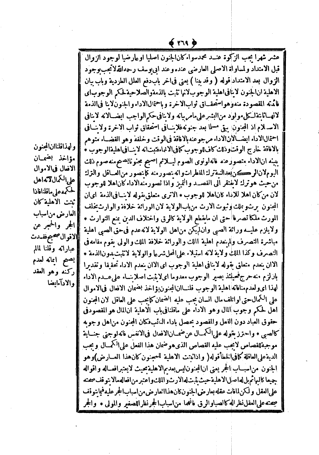 ـــــــــــــــــــــــــــــQعَشَرَ شَهْرًا يَجِبُ الزَّكَاةُ عِنْدَ مُحَمَّدٍ سَوَاءٌ كَانَ الْجُنُونُ أَصْلِيًّا أَوْ عَارِضِيًّا لِوُجُودِ الزَّوَالِ قَبْلَ الِامْتِدَادِ وَلِمُسَاوَاةِ الْأَصْلِيِّ الْعَارِضِيَّ عِنْدَهُ وَعِنْدَ أَبِي يُوسُفَ - رَحِمَهُ اللَّهُ - لَا تَجِبُ بِوُجُودِ الزَّوَالِ بَعْدَ الِامْتِدَادِ قَوْلُهُ (وَقَدْ بَيَّنَّا) يَعْنِي فِي آخِرِ بَابِ دَفْعِ الْعِلَلِ الطَّرْدِيَّةِ وَبَابِ بَيَانِ الْأَهْلِيَّةِ أَنَّ الْجُنُونَ لَا يُنَافِي أَهْلِيَّةَ الْوُجُوبِ لِأَنَّهَا تَثْبُتُ بِالذِّمَّةِ وَالصَّلَاحِيَّةِ لِحُكْمِ الْوُجُوبِ أَيْ فَائِدَتِهِ الْمَقْصُودَةِ مِنْهُ وَهُوَ اسْتِحْقَاقُ ثَوَابِ الْآخِرَةِ وَبِاحْتِمَالِ الْأَدَاءِ، وَالْجُنُونُ لَا يُنَافِي الذِّمَّةَ لِأَنَّهَا ثَابِتَةٌ لِكُلِّ مَوْلُودٍ مِنْ الْبَشَرِ عَلَى مَا مَرَّ بَيَانُهُ وَلَا يُنَافِي حُكْمَ الْوَاجِبِ أَيْضًا لِأَنَّهُ لَا يُنَافِي الْإِسْلَامَ إذْ الْمَجْنُونُ يَبْقَى مُسْلِمًا بَعْدَ جُنُونِهِ فَلَا يُنَافِي اسْتِحْقَاقَ ثَوَابِ الْآخِرَةِ وَلَا يُنَافِي احْتِمَالَ الْأَدَاءِ أَيْضًا لِأَنَّ الْأَدَاءَ مَرْجُوٌّ عَنْهُ بِالْإِفَاقَةِ فِي الْوَقْتِ وَخَلَفُهُ وَهُوَ الْقَضَاءُ مُتَوَهَّمٌ بِالْإِفَاقَةِ خَارِجَ الْوَقْتِ وَذَلِكَ كَافٍ لِلْوُجُوبِ كَمَا فِي الْإِغْمَاءِ فَثَبَتَ أَنَّهُ لَا يُنَافِي أَهْلِيَّةَ الْوُجُوبِ يُبَيِّنُهُ أَنَّ الْأَدَاءَ مُتَصَوَّرٌ عَنْهُ فَإِنَّهُ لَوْ نَوَى الصَّوْمَ لَيْلًا ثُمَّ أَصْبَحَ مَجْنُونًا يَصِحُّ مِنْهُ صَوْمُ ذَلِكَ الْيَوْمِ لِأَنَّ الرُّكْنَ بَعْدَ النِّيَّةِ تَرْكُ الْمُفْطِرَاتِ وَأَنَّهُ يُتَصَوَّرُ مِنْهُ كَمَا يُتَصَوَّرُ مِنْ الْعَاقِلِ وَالتَّرْكُ مِنْ حَيْثُ هُوَ تَرْكٌ لَا يَفْتَقِرُ إلَى الْقَصْدِ وَالتَّمْيِيزِ وَإِذَا تُصُوِّرَ مِنْهُ الْأَدَاءُ كَانَ أَهْلًا لِلْوُجُوبِ لِأَنَّ مَنْ كَانَ أَهْلًا لِلْأَدَاءِ كَانَ أَهْلًا لِلْوُجُوبِ أَلَا تَرَى مُتَعَلِّقٌ بِقَوْلِهِ لَا يُنَافِي الذِّمَّةَ أَيْ أَنَّ الْمَجْنُونَ يَرِثُ وَيَمْلِكُ وَثُبُوتُ الْإِرْثِ مِنْ بَابِ الْوِلَايَةِ لِأَنَّ الْوِرَاثَةَ خِلَافَةٌ وَالْوَارِثُ يَخْلُفُ الْمُوَرِّثَ مِلْكًا تَصَرُّفًا حَتَّى إنَّ مَا يَقْطَعُ الْوِلَايَةَ كَالرِّقِّ وَاخْتِلَافِ الدِّينِ يَمْنَعُ التَّوَارُثَ.