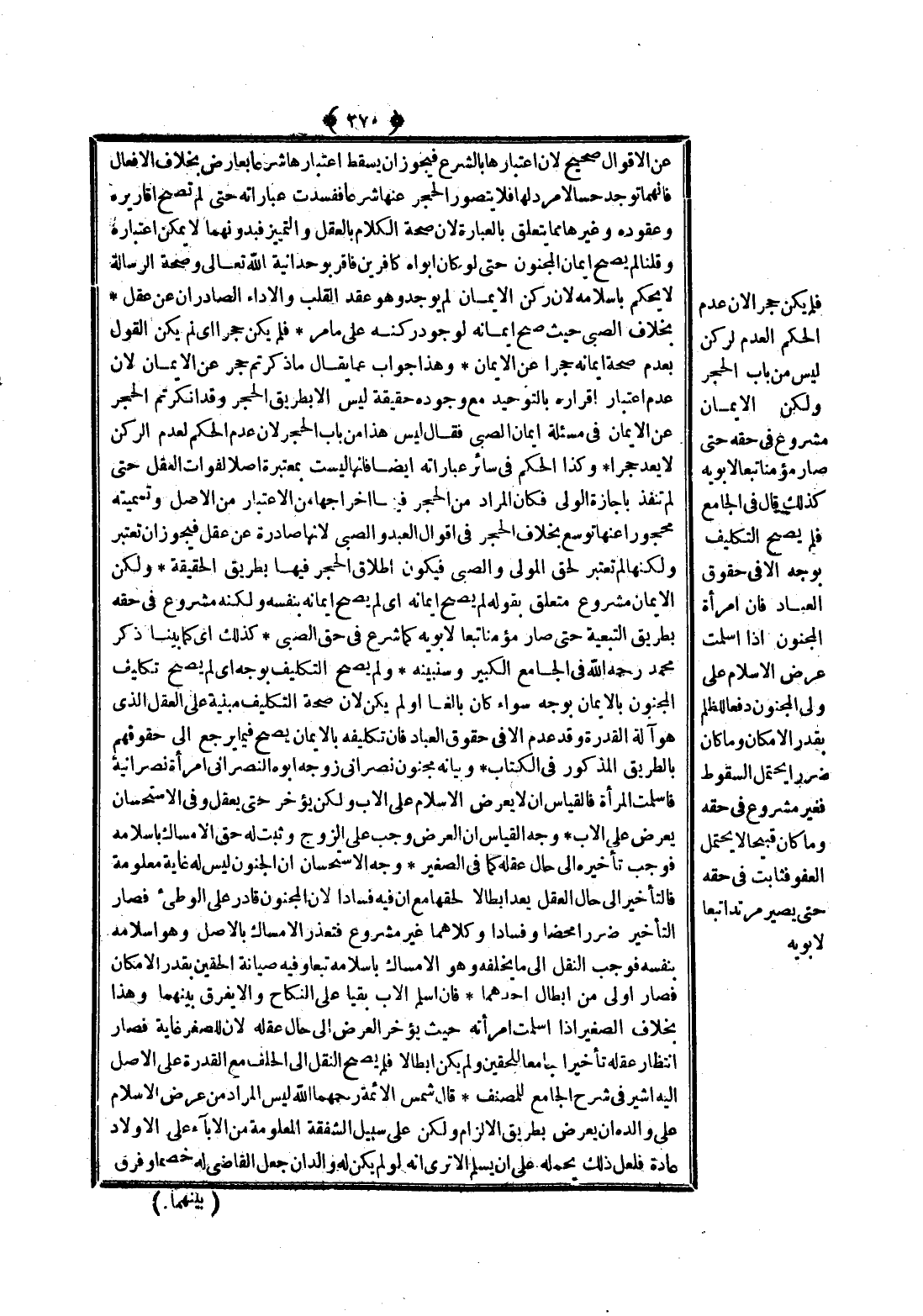 فَلَمْ يَكُنْ حَجْرًا لِأَنَّ عَدَمَ الْحُكْمِ لِعَدَمِ الرُّكْنِ لَيْسَ مِنْ بَابِ الْحَجْرِ وَلَكِنْ الْإِيمَانُ مَشْرُوعٌ فِي حَقِّهِ حَتَّى صَارَ مُؤْمِنًا تَبَعًا لِأَبَوَيْهِ كَذَلِكَ قَالَ فِي الْجَامِعِ فَلَمْ يَصِحَّ التَّكْلِيفُ بِوَجْهٍ إلَّا فِي حُقُوقِ الْعِبَادِ فَإِنَّ امْرَأَةَ الْمَجْنُونِ إذَا أَسْلَمَتْ عُرِضَ الْإِسْلَامُ عَلَى وَلِيِّ الْمَجْنُونِ دَفْعًا لِلظُّلْمِ بِقَدْرِ الْإِمْكَانِ.