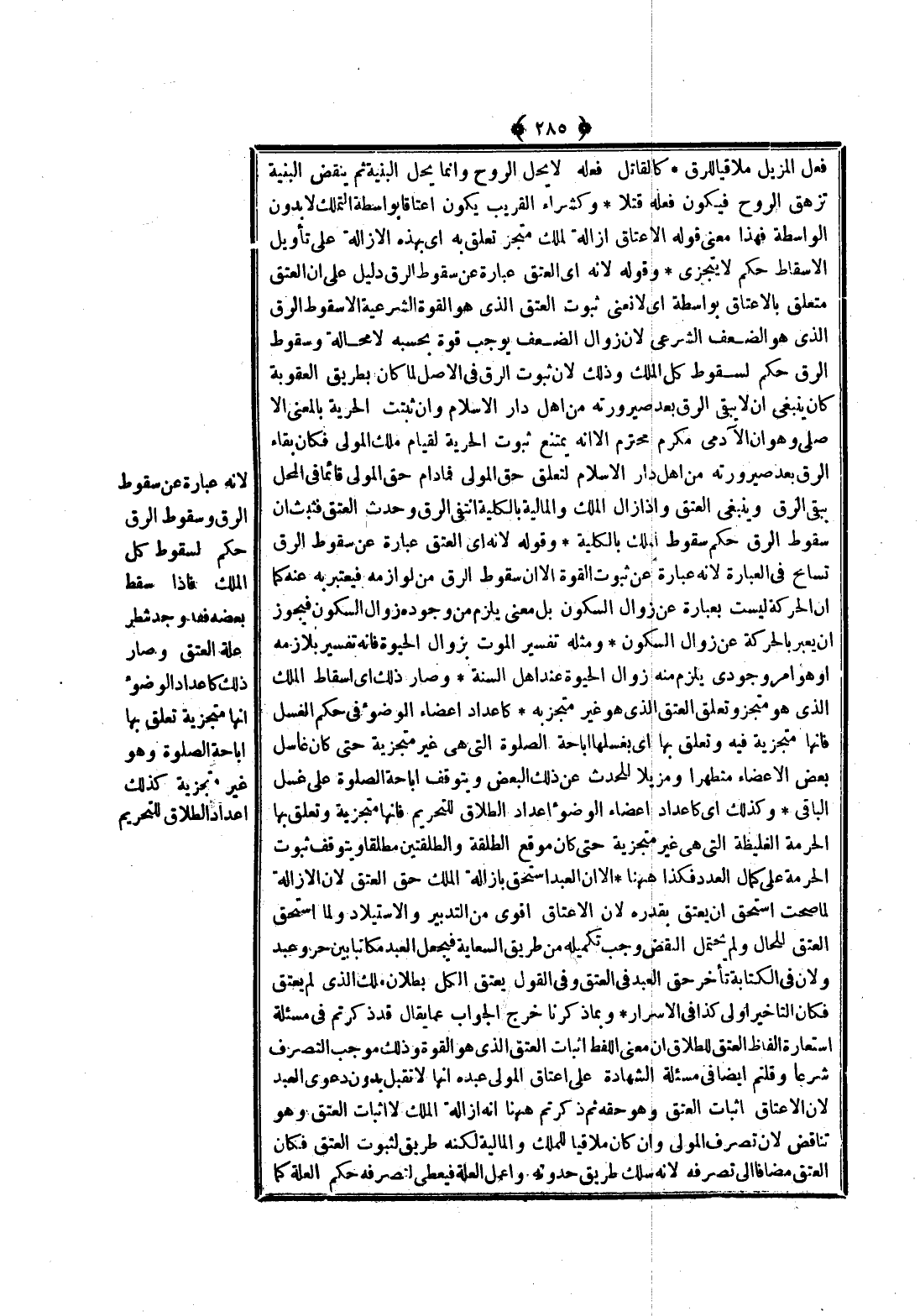 ـــــــــــــــــــــــــــــQفِعْلُ الْمُزِيلِ مُلَاقِيًا لِلرِّقِّ كَالْقَاتِلِ فِعْلُهُ لَا يَحِلُّ الرُّوحَ وَإِنَّمَا يَحِلُّ الْبِنْيَةَ ثُمَّ بِنَقْضِ الْبِنْيَةِ تَزْهَقُ الرُّوحُ فَيَكُونُ فِعْلُهُ قَتْلًا وَكَشِرَاءِ الْقَرِيبِ يَكُونُ إعْتَاقًا بِوَاسِطَةِ التَّمَلُّكِ لَا بِدُونِ الْوَاسِطَةِ فَهَذَا مَعْنَى قَوْلِهِ الْإِعْتَاقُ إزَالَةٌ لِمِلْكٍ مُتَجَزٍّ تَعَلَّقَ بِهِ أَيْ بِهَذِهِ الْإِزَالَةِ عَلَى تَأْوِيلِ الْإِسْقَاطِ حُكْمٌ لَا يَتَجَزَّأُ.