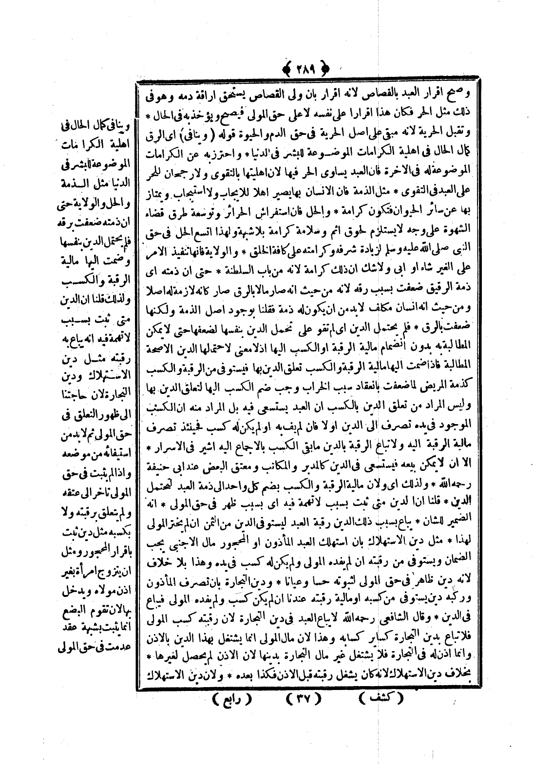 وَيُنَافِي كَمَالَ الْحَالِ فِي أَهْلِيَّةِ الْكَرَامَاتِ الْمَوْضُوعَةِ لِلْبَشَرِ فِي الدُّنْيَا مِثْلُ الذِّمَّةِ وَالْحِلِّ وَالْوِلَايَةِ حَتَّى أَنَّ ذِمَّتَهُ ضَعُفَتْ بِرِقِّهِ فَلَمْ يَحْتَمِلْ الدَّيْنَ بِنَفْسِهَا وَضُمَّتْ إلَيْهَا مَالِيَّةُ الرَّقَبَةِ وَالْكَسْبُ وَلِذَلِكَ قُلْنَا إنَّ الدَّيْنَ مَتَى ثَبَتَ بِسَبَبٍ لَا تُهْمَةَ فِيهِ أَنَّهُ يُبَاعُ بِهِ رَقَبَتُهُ مِثْلُ دَيْنِ التِّجَارَةِ لِأَنَّ حَاجَتَنَا إلَى ظُهُورِ التَّعَلُّقِ فِي حَقِّ الْمَوْلَى ثُمَّ لَا بُدَّ مِنْ اسْتِيفَائِهِ مِنْ مَوْضِعِهِ وَإِذَا لَمْ يَثْبُتْ فِي حَقِّ الْمَوْلَى تَأَخَّرَ إلَى عِتْقِهِ وَلَمْ يَتَعَلَّقْ بِرَقَبَتِهِ وَلَا بِكَسْبِهِ مِثْلُ دَيْنٍ ثَبَتَ بِإِقْرَارِ الْمَحْجُورِ وَمِثْلُ أَنْ يَتَزَوَّجَ امْرَأَةً بِغَيْرِ إذْنِ مَوْلَاهُ وَيَدْخُلَ بِهَا لِأَنَّ تَقَوُّمَ الْبُضْعِ إنَّمَا يَثْبُتُ بِشُبْهَةِ عَقْدٍ عُدِمَتْ فِي حَقِّ الْمَوْلَى