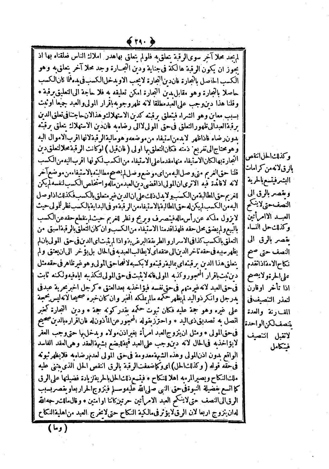 ـــــــــــــــــــــــــــــQلَمْ يَجِدْ مَحَلًّا آخَرَ سِوَى الرَّقَبَةِ يَتَعَلَّقُ بِهِ فَلَوْ لَمْ يَتَعَلَّقْ بِهَا هَدَرَ أَمْلَاكُ النَّاسِ فَعَلَّقْنَاهُ بِهَا إذْ يَجُوزُ أَنْ يَكُونَ الرَّقَبَةُ هَالِكَةً فِي جِنَايَةٍ وَدَيْنُ التِّجَارَةِ وَجَدَ مَحَلًّا آخَرَ يَتَعَلَّقُ بِهِ وَهُوَ الْكَسْبُ الْحَاصِلُ بِالتِّجَارَةِ فَإِنَّ دَيْنَ التِّجَارَةِ لَا يَجِبُ إلَّا وَيَدْخُلُ الْكَسْبُ فِي يَدِهِ فَلَمَّا كَانَ الْكَسْبُ حَاصِلًا بِالتِّجَارَةِ وَهُوَ مُقَابَلٌ بِدَيْنِ التِّجَارَةِ أَمْكَنَ تَعْلِيقُهُ بِهِ فَلَا حَاجَةَ إلَى التَّعْلِيقِ بِرَقَبَةٍ.