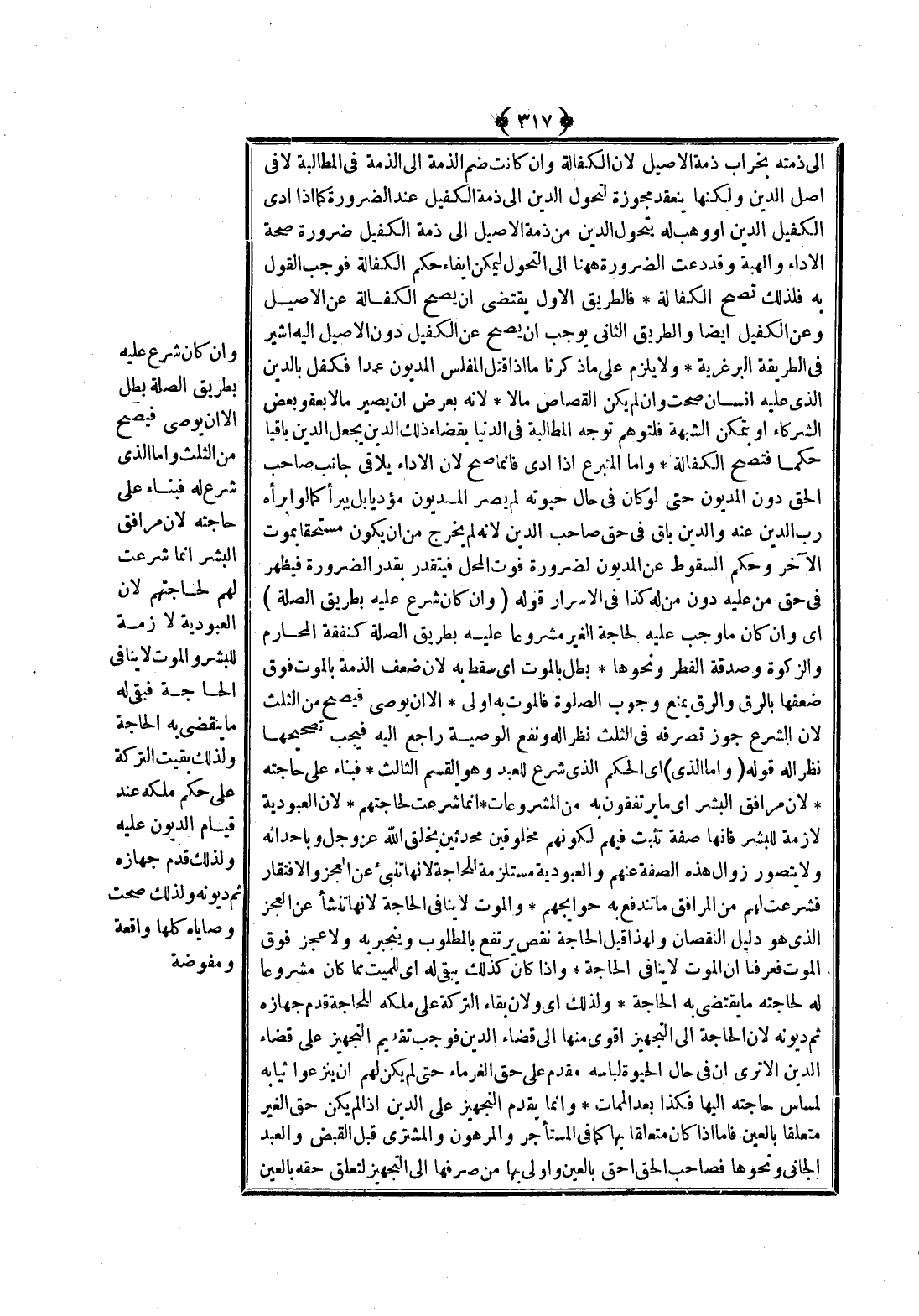 وَلَا يَلْزَمُ عَلَى مَا ذَكَرْنَا مَا إذَا قَتَلَ الْمُفْلِسُ الْمَدْيُونَ عَمْدًا فَكَفَلَ بِالدَّيْنِ الَّذِي عَلَيْهِ إنْسَانٌ صَحَّتْ وَإِنْ لَمْ يَكُنْ الْقِصَاصُ مَالًا لِأَنَّهُ بِعَرَضٍ أَنْ يَصِيرَ مَالًا بِعَفْوِ بَعْضِ الشُّرَكَاءِ أَوْ بِتَمَكُّنِ الشُّبْهَةِ فَلِتَوَهُّمِ تَوَجُّهِ الْمُطَالَبَةِ فِي الدُّنْيَا بِقَضَاءِ ذَلِكَ الدَّيْنِ يُجْعَلُ الدَّيْنُ بَاقِيًا حُكْمًا فَتَصِحُّ الْكَفَالَةُ وَأَمَّا الْمُتَبَرِّعُ إذَا أَدَّى فَإِنَّمَا صَحَّ لِأَنَّ الْأَدَاءَ يُلَاقِي جَانِبَ صَاحِبِ الْحَقِّ دُونَ الْمَدْيُونِ حَتَّى لَوْ كَانَ فِي حَالِ حَيَاتِهِ لَمْ يَصِرْ الْمَدْيُونُ مُؤَدِّيًا بَلْ يَبْرَأُ كَمَا لَوْ أَبْرَأَهُ رَبُّ الدَّيْنِ عَنْهُ وَالدَّيْنُ بَاقٍ فِي حَقِّ صَاحِبِ الدَّيْنِ لِأَنَّهُ لَمْ يَخْرُجْ مِنْ أَنْ يَكُونَ مُسْتَحِقًّا بِمَوْتِ الْآخَرِ وَحُكْمُ السُّقُوطِ عَنْ الْمَدْيُونِ لِضَرُورَةِ فَوْتِ الْمَحَلِّ فَيَتَقَدَّرُ بِقَدْرِ الضَّرُورَةِ فَيَظْهَرُ فِي حَقِّ مَنْ عَلَيْهِ دُونَ مَنْ لَهُ كَذَا فِي الْأَسْرَارِ قَوْلُهُ (وَإِنْ كَانَ شُرِعَ عَلَيْهِ بِطَرِيقِ الصِّلَةِ) أَيْ وَإِنْ كَانَ مَا وَجَبَ عَلَيْهِ لِحَاجَةِ الْغَيْرِ مَشْرُوعًا عَلَيْهِ بِطَرِيقِ الصِّلَةِ كَنَفَقَةِ الْمَحَارِمِ وَالزَّكَاةِ وَصَدَقَةِ الْفِطْرِ وَنَحْوِهَا بَطَلَ بِالْمَوْتِ أَيْ سَقَطَ بِهِ لِأَنَّ ضَعْفَ الذِّمَّةِ بِالْمَوْتِ فَوْقَ ضَعْفِهَا بِالرِّقِّ وَالرِّقُّ يَمْنَعُ وُجُوبَ الصَّلَاةِ فَالْمَوْتُ بِهِ أَوْلَى إلَّا أَنْ يُوصِيَ فَيَصِحَّ مِنْ الثُّلُثِ لِأَنَّ الشَّرْعَ جَوَّزَ تَصَرُّفَهُ فِي الثُّلُثِ نَظَرًا لَهُ وَنَفْعُ الْوَصِيَّةِ رَاجِعٌ إلَيْهِ فَيَجِبُ تَصْحِيحُهَا نَظَرًا لَهُ قَوْلُهُ (وَأَمَّا الَّذِي) أَيْ الْحُكْمُ الَّذِي شُرِعَ لِلْعَبْدِ وَهُوَ الْقِسْمُ الثَّالِثُ.