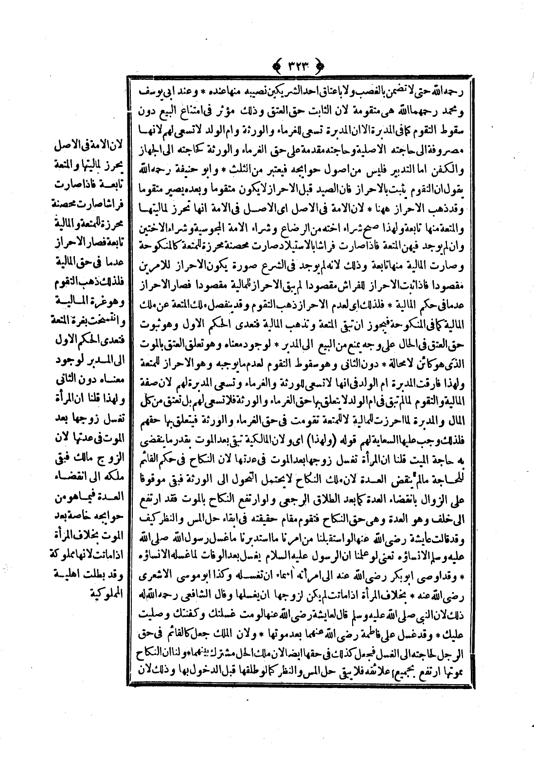 وَلِهَذَا قُلْنَا إنَّ الْمَرْأَةَ تُغَسِّلُ زَوْجَهَا بَعْدَ الْمَوْتِ فِي عِدَّتِهَا لِأَنَّ الزَّوْجَ مَالِكٌ فَبَقِيَ مِلْكُهُ إلَى انْقِضَاءِ الْعِدَّةِ فِيمَا هُوَ مِنْ حَوَائِجِهِ خَاصَّةً بَعْدَ الْمَوْتِ بِخِلَافِ الْمَرْأَةِ إذَا مَاتَتْ لِأَنَّهَا مَمْلُوكَةٌ وَقَدْ بَطَلَتْ أَهْلِيَّةُ الْمَمْلُوكِيَّةِ