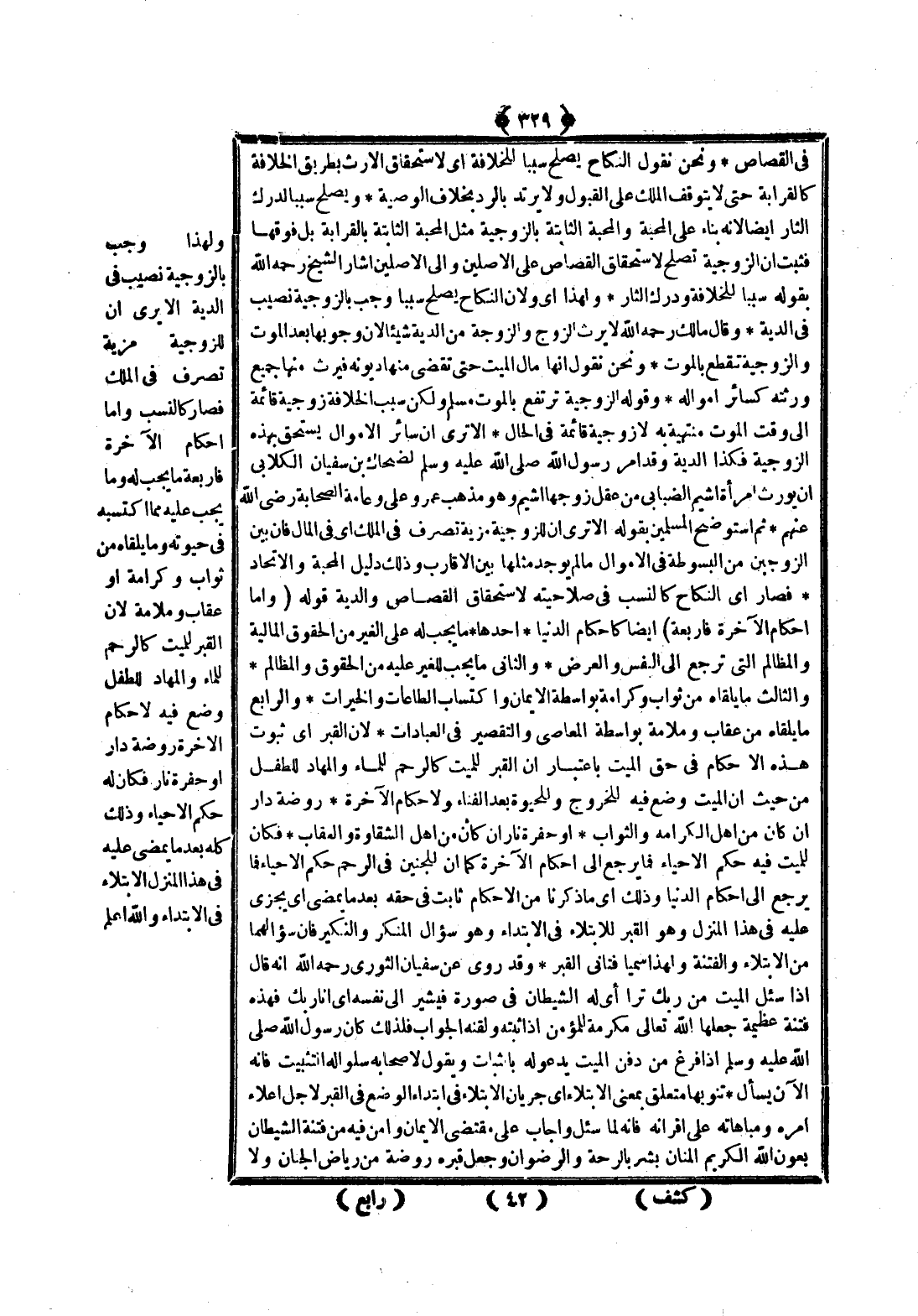 وَلِهَذَا وَجَبَ بِالزَّوْجِيَّةِ نَصِيبٌ فِي الدِّيَةِ أَلَا يُرَى أَنَّ لِلزَّوْجِيَّةِ مِزْيَةَ تَصَرُّفٍ فِي الْمِلْكِ فَصَارَ كَالنَّسَبِ وَأَمَّا أَحْكَامُ الْآخِرَةِ فَأَرْبَعَةٌ مَا يَجِبُ لَهُ وَمَا يَجِبُ عَلَيْهِ مِمَّا اكْتَسَبَهُ فِي حَيَاتِهِ وَمَا يَلْقَاهُ مِنْ ثَوَابٍ وَكَرَامَةٍ أَوْ عِقَابٍ وَمَلَامَةٍ لِأَنَّ الْقَبْرَ لِلْمَيِّتِ كَالرَّحِمِ لِلْمَاءِ وَالْمِهَادِ لِلطِّفْلِ وُضِعَ فِيهِ لِأَحْكَامِ الْآخِرَةِ رَوْضَةُ دَارٍ أَوْ حُفْرَةُ نَارٍ فَكَانَ لَهُ حُكَّامُ الْأَحْيَاءِ وَذَلِكَ كُلُّهُ بَعْدَ مَا يَمْضِي عَلَيْهِ فِي هَذَا الْمَنْزِلِ الِابْتِلَاءُ فِي الِابْتِدَاءِ وَاَللَّهُ أَعْلَمُ.