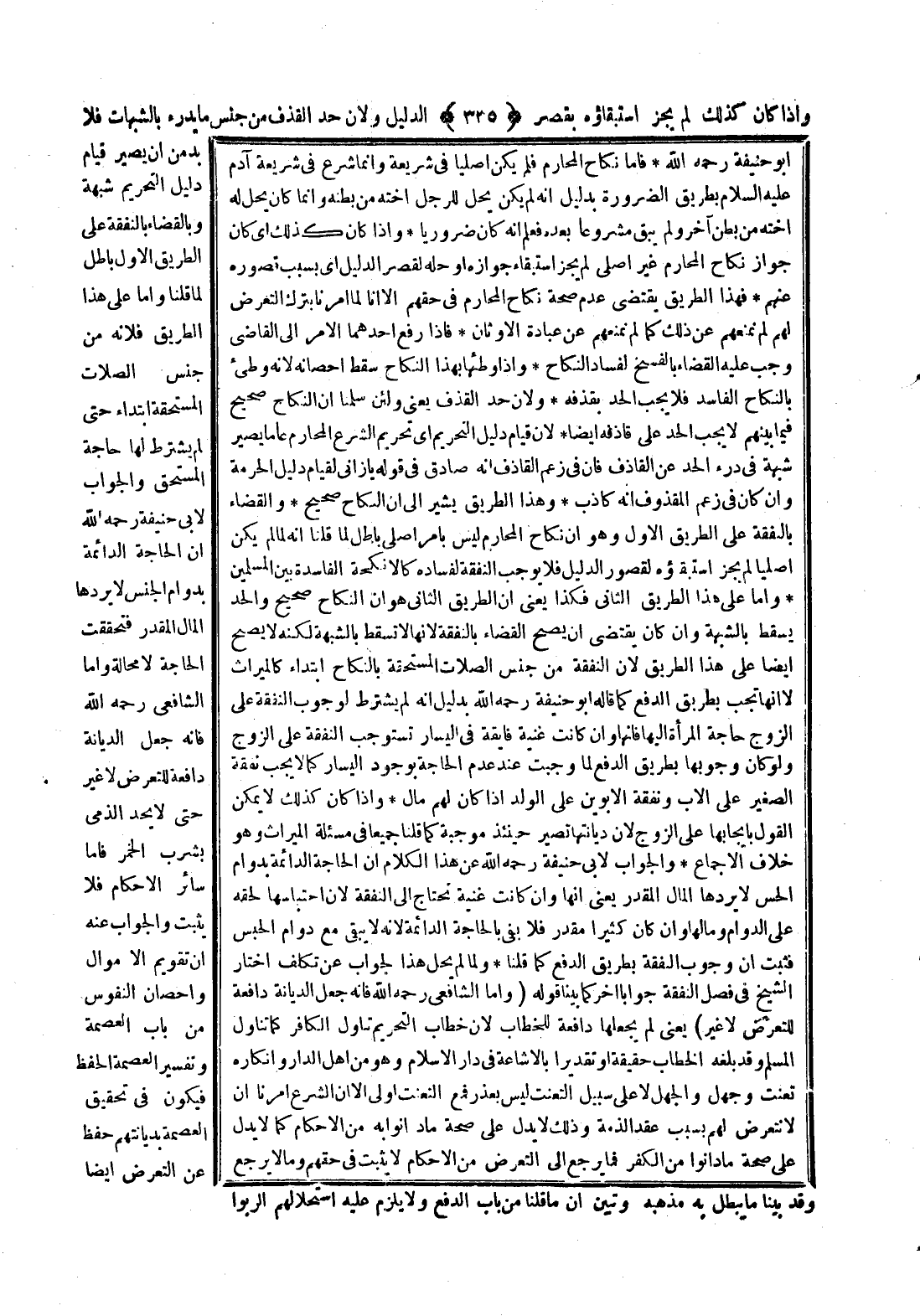 وَإِذَا كَانَ كَذَلِكَ لَمْ يَجُزْ اسْتِبْقَاؤُهُ بِقَصْرِ الدَّلِيلِ وَلِأَنَّ حَدَّ الْقَذْفِ مِنْ جِنْسِ مَا يُدْرَأُ بِالشُّبُهَاتِ فَلَا بُدَّ مِنْ أَنْ يَصِيرَ قِيَامُ دَلِيلِ التَّحْرِيمِ شُبْهَةً وَبِالْقَضَاءِ بِالنَّفَقَةِ عَلَى الطَّرِيقِ الْأَوَّلِ بَاطِلٌ لِمَا قُلْنَا. وَأَمَّا عَلَى هَذَا الطَّرِيقِ فَلِأَنَّهُ مِنْ جِنْسِ الصِّلَاتِ الْمُسْتَحَقَّةِ ابْتِدَاءً حَتَّى لَمْ يُشْتَرَطْ لَهَا حَاجَةُ الْمُسْتَحِقِّ.