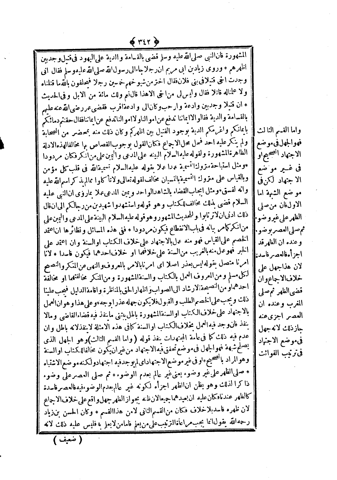 قَوْلُهُ (وَأَمَّا الْقِسْمُ الثَّالِثُ) وَهُوَ الْجَهْلُ الَّذِي يَصْلُحُ شُبْهَةً فَهُوَ الْجَهْلُ فِي مَوْضِعٍ تَحَقَّقَ فِيهِ الِاجْتِهَادُ مِنْ غَيْرِ أَنْ يَكُونَ مُخَالِفًا لِلْكِتَابِ أَوْ السُّنَّةِ وَهُوَ الْمُرَادُ بِالصَّحِيحِ. أَوْ فِي غَيْرِ مَوْضِعِ الِاجْتِهَادِ أَيْ لَمْ يُوجَدْ فِيهِ اجْتِهَادٌ وَلَكِنَّهُ مَوْضِعُ الِاشْتِبَاهِ. صَلَّى الظُّهْرَ عَلَى غَيْرِ وُضُوءٍ يَعْنِي غَيْرَ عَالِمٍ بِعَدَمِ الْوُضُوءِ. ثُمَّ صَلَّى الْعَصْرَ عَلَى وُضُوءٍ ذَاكِرًا لِذَلِكَ وَهُوَ يَظُنُّ أَنَّ الظُّهْرَ أَجْزَأَهُ لِكَوْنِهِ غَيْرَ عَالِمٍ بِعَدَمِ الْوُضُوءِ فِيهِ فَالْعَصْرُ فَاسِدَةٌ كَالظُّهْرِ عِنْدَنَا فَكَانَ عَلَيْهِ أَنْ يُعِيدَهُمَا جَمِيعًا؛ لِأَنَّ ظَنَّهُ بِجَوَازِ الظُّهْرِ جَهْلٌ وَاقِعٌ عَلَى خِلَافِ الْإِجْمَاعِ؛ لِأَنَّ ظُهْرَهُ فَاسِدٌ بِلَا خِلَافٍ فَكَانَ مِنْ الْقِسْمِ الثَّانِي لَا مِنْ هَذَا الْقِسْمِ.