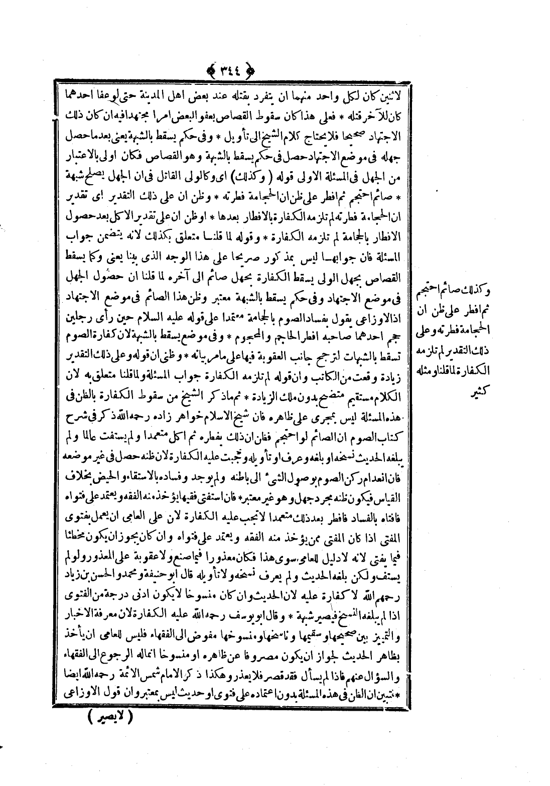 أَوْ ظَنَّ أَنَّ عَلَى تَقْدِيرِ الْأَكْلِ بَعْدَ حُصُولِ الْإِفْطَارِ بِالْحِجَامَةِ لَمْ تَلْزَمْهُ الْكَفَّارَةُ. وَقَوْلُهُ لِمَا قُلْنَا مُتَعَلِّقٌ بِكَذَلِكَ؛ لِأَنَّهُ يَتَضَمَّنُ جَوَابَ الْمَسْأَلَةِ فَإِنَّ جَوَابَهَا لَيْسَ بِمَذْكُورٍ صَرِيحًا عَلَى هَذَا الْوَجْهِ الَّذِي بَيَّنَّا يَعْنِي وَكَمَا يَسْقُطُ الْقِصَاصُ بِجَهْلِ الْوَلِيِّ تَسْقُطُ الْكَفَّارَةُ بِجَهْلِ صَائِمٍ إلَى آخِرِهِ لِمَا قُلْنَا إنَّ حُصُولَ الْجَهْلِ فِي مَوْضِعِ الِاجْتِهَادِ وَفِي حُكْمٍ يَسْقُطُ بِالشُّبْهَةِ مُعْتَبَرٌ، وَظَنُّ هَذَا الصَّائِمِ فِي مَوْضِعِ الِاجْتِهَادِ، إذْ الْأَوْزَاعِيُّ يَقُولُ بِفَسَادِ الصَّوْمِ بِالْحِجَامَةِ مُعْتَمِدًا عَلَى قَوْلِهِ - عَلَيْهِ السَّلَامُ - حِين «رَأَى رَجُلَيْنِ حَجَمَ أَحَدُهُمَا صَاحِبَهُ أَفْطَرَ الْحَاجِمُ وَالْمَحْجُومُ» . وَفِي مَوْضِعٍ يَسْقُطُ بِالشُّبْهَةِ؛ لِأَنَّ كَفَّارَةَ الصَّوْمِ تَسْقُطُ بِالشُّبُهَاتِ لِتَرَجُّحِ جَانِبِ الْعُقُوبَةِ فِيهَا عَلَى مَا مَرَّ بَيَانُهُ. وَظَنِّي أَنَّ قَوْلَهُ وَعَلَى ذَلِكَ التَّقْدِيرِ زِيَادَةٌ وَقَعَتْ مِنْ الْكَاتِبِ وَأَنَّ قَوْلَهُ لَمْ تَلْزَمْهُ الْكَفَّارَةُ جَوَابُ الْمَسْأَلَةِ وَلِمَا قُلْنَا مُتَعَلِّقٌ بِهِ؛ لِأَنَّ الْكَلَامَ مُسْتَقِيمٌ مُتَّضِحٌ بِدُونِ تِلْكَ الزِّيَادَةِ. ثُمَّ مَا ذَكَرَ الشَّيْخُ مِنْ سُقُوطِ الْكَفَّارَةِ بِالظَّنِّ فِي هَذِهِ الْمَسْأَلَةِ لَيْسَ بِمُجْرًى عَلَى ظَاهِرِهِ فَإِنَّ شَيْخَ الْإِسْلَامِ خُوَاهَرْ زَادَهْ - رَحِمَهُ اللَّهُ - ذَكَرَ فِي شَرْحِ كِتَابِ الصَّوْمِ أَنَّ الصَّائِمَ لَوْ احْتَجَمَ فَظَنَّ أَنَّ ذَلِكَ يُفْطِرُهُ ثُمَّ أَكَلَ مُتَعَمِّدًا وَلَمْ يَسْتَفْتِ عَالِمًا وَلَمْ يَبْلُغْهُ الْحَدِيثُ نَسَخَهُ أَوْ بَلَغَهُ وَعَرَفَ تَأْوِيلَهُ وَجَبَتْ عَلَيْهِ الْكَفَّارَةُ؛ لِأَنَّ ظَنَّهُ حَصَلَ فِي غَيْرِ مَوْضِعِهِ فَإِنَّ انْعِدَامَ رُكْنِ الصَّوْمِ بِوُصُولِ الشَّيْءِ إلَى بَاطِنِهِ وَلَمْ يُوجَدْ وَفَسَادُهُ بِالِاسْتِقَاءِ وَالْحَيْضِ بِخِلَافِ الْقِيَاسِ فَيَكُونُ ظَنُّهُ مُجَرَّدَ جَهْلٍ وَهُوَ غَيْرُ مُعْتَبَرٍ.