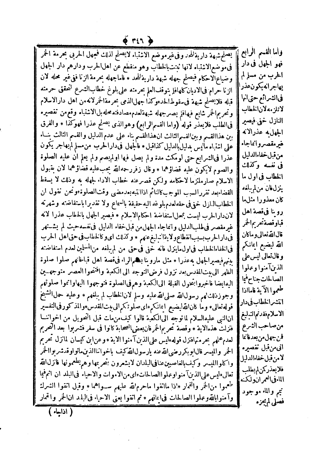 وَأَمَّا الْقِسْمُ الرَّابِعُ فَهُوَ الْجَهْلُ فِي دَارِ الْحَرْبِ مِنْ مُسْلِمٍ لَمْ يُهَاجِرْ أَنَّهُ يَكُونُ عُذْرًا فِي الشَّرَائِعِ حَتَّى إنَّهَا لَا تَلْزَمُهُ؛ لِأَنَّ الْخِطَابَ النَّازِلَ خَفِيَ فَيَصِيرُ الْجَهْلُ بِهِ عُذْرًا؛ لِأَنَّهُ غَيْرُ مُقَصِّرٍ وَإِنَّمَا جَاءَ مِنْ قِبَلِ خَفَاءِ الدَّلِيلِ فِي نَفْسِهِ وَكَذَلِكَ الْخِطَابُ فِي أَوَّلِ مَا يَنْزِلُ فَإِنْ مَنْ لَمْ يَبْلُغْهُ كَانَ مَعْذُورًا مِثْلَ مَا رَوَيْنَا فِي قِصَّةِ أَهْلِ قُبَا وَقِصَّةِ تَحْرِيمِ الْخَمْرِ قَالَ اللَّهُ تَعَالَى {وَمَا كَانَ اللَّهُ لِيُضِيعَ إِيمَانَكُمْ} [البقرة: 143] وَقَالَ تَعَالَى {لَيْسَ عَلَى الَّذِينَ آمَنُوا وَعَمِلُوا الصَّالِحَاتِ جُنَاحٌ فِيمَا طَعِمُوا} [المائدة: 93] الْآيَةُ فَأَمَّا إذَا انْتَشَرَ الْخِطَابُ فِي دَارِ الْإِسْلَامِ فَقَدْ تَمَّ التَّبْلِيغُ مِنْ صَاحِبِ الشَّرْعِ فَمَنْ جَهِلَ مِنْ بَعْدُ فَإِنَّمَا أُتِيَ مِنْ قِبَلِ تَقْصِيرِهِ لَا مِنْ قِبَلِ خَفَاءِ الدَّلِيلِ فَلَا يُعْذَرُ كَمَنْ لَمْ يَطْلُبْ الْمَاءَ فِي الْعُمْرَانِ وَلَكِنَّهُ تَيَمَّمَ وَالْمَاءُ مَوْجُودٌ فَصَلَّى لَمْ يُجْزِهِ