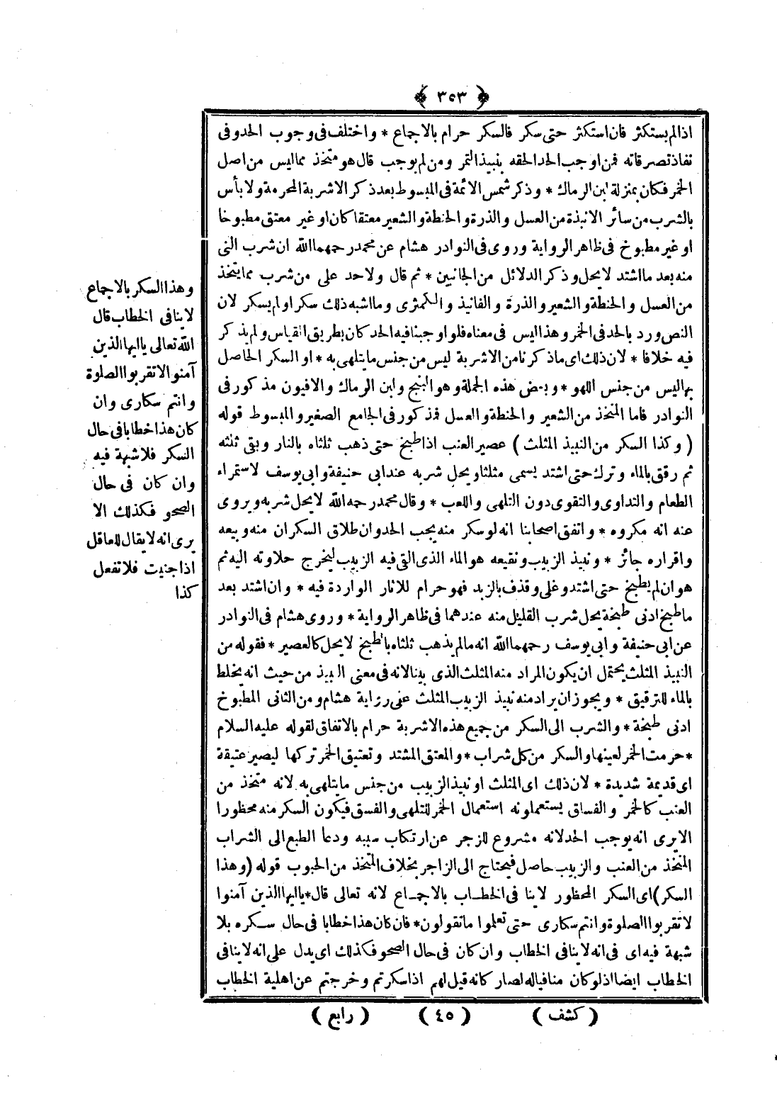 وَذَكَرَ الدَّلَائِلَ مِنْ الْجَانِبَيْنِ ثُمَّ قَالَ وَلَا حَدَّ عَلَى مَنْ شَرِبَ مِمَّا يُتَّخَذُ مِنْ الْعَسَلِ وَالْحِنْطَةِ وَالشَّعِيرِ وَالذُّرَةِ وَالْفَانِيذِ وَالْكُمَّثْرَى وَمَا أَشْبَهَ ذَلِكَ سَكِرَ أَوْ لَمْ يَسْكَرْ؛ لِأَنَّ النَّصَّ وَرَدَ بِالْحَدِّ فِي الْخَمْرِ وَهَذَا لَيْسَ فِي مَعْنَاهُ فَلَوْ أَوْجَبْنَا فِيهِ الْحَدَّ كَانَ بِطَرِيقِ الْقِيَاسِ وَلَمْ يُذْكَرْ فِيهِ خِلَافًا لِأَنَّ ذَلِكَ أَيْ مَا ذَكَرْنَا مِنْ الْأَشْرِبَةِ لَيْسَ مِنْ جِنْسِ مَا يَتَلَهَّى بِهِ أَوْ السُّكْرُ الْحَاصِلُ بِهَا لَيْسَ مِنْ جِنْسِ اللَّهْوِ وَبَعْضُ هَذِهِ الْجُمْلَةُ وَهُوَ الْبَنْجُ وَلَبَنُ الرِّمَاكِ وَالْأَفْيُونُ مَذْكُورٌ فِي النَّوَادِرِ فَأَمَّا الْمُتَّخَذُ مِنْ الشَّعِيرِ وَالْحِنْطَةِ وَالْعَسَلِ فَمَذْكُورٌ فِي الْجَامِعِ الصَّغِيرِ وَالْمَبْسُوطِ.