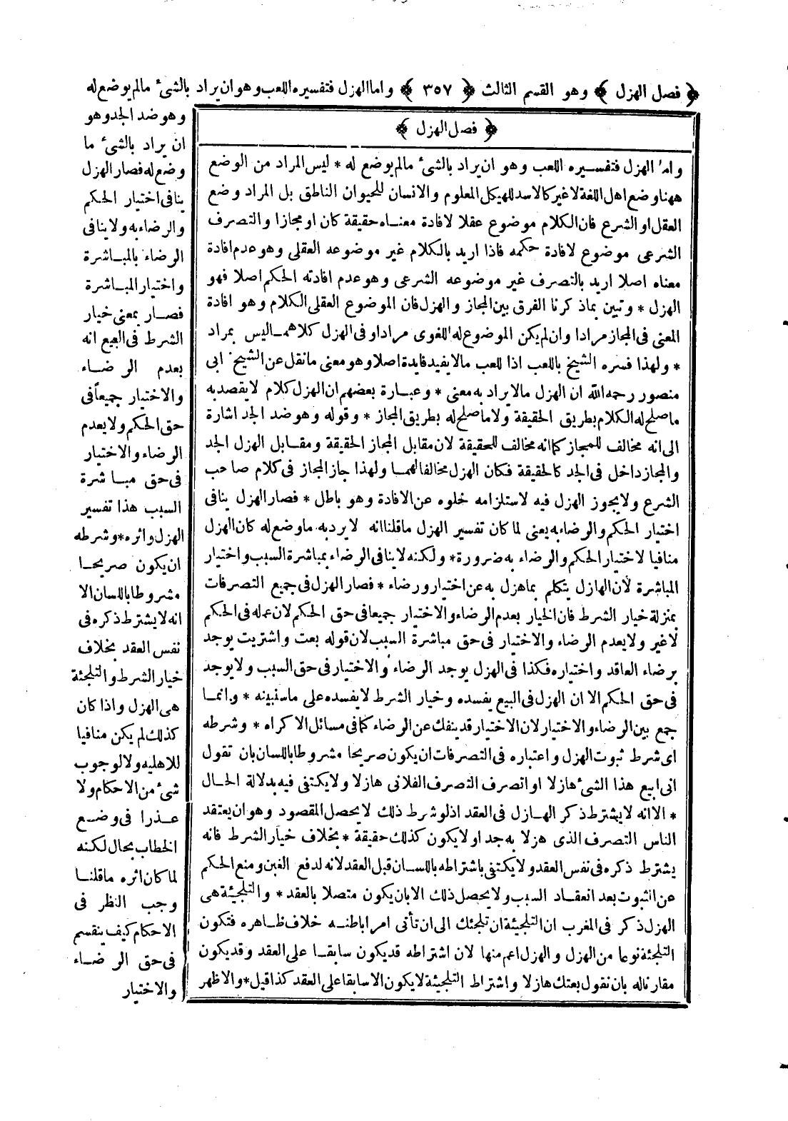 (فَصْلُ الْهَزْلِ) وَهُوَ الْقِسْمُ الثَّالِثُ. وَأَمَّا الْهَزْلُ فَتَفْسِيرُهُ اللَّعِبَ وَهُوَ أَنْ يُرَادَ بِالشَّيْءِ مَا لَمْ يُوضَعْ لَهُ وَهُوَ ضِدُّ الْجَدِّ وَهُوَ أَنْ يُرَادَ بِالشَّيْءِ مَا وُضِعَ لَهُ فَصَارَ الْهَزْلُ يُنَافِي اخْتِيَارَ الْحُكْمِ وَالرِّضَا بِهِ وَلَا يُنَافِي الرِّضَاءَ بِالْمُبَاشَرَةِ وَاخْتِيَارَ الْمُبَاشَرَةِ فَصَارَ بِمَعْنَى خِيَارِ الشَّرْطِ فِي الْبَيْعِ أَنَّهُ بِعَدَمِ الرِّضَاءِ وَالِاخْتِيَارِ جَمِيعًا فِي حَقِّ الْحُكْمِ وَلَا يُعْدَمُ الرِّضَاءُ وَالِاخْتِيَارُ فِي حَقِّ مُبَاشَرَةِ السَّبَبِ هَذَا تَفْسِيرُ الْهَزْلِ وَأَثَرُهُ وَشَرْطُهُ أَنْ يَكُونَ صَرِيحًا مَشْرُوطًا بِاللِّسَانِ إلَّا أَنَّهُ لَا يُشْتَرَطُ ذِكْرُهُ فِي نَفْسِ الْعَقْدِ بِخِلَافِ خِيَارِ الشَّرْطِ وَالتَّلْجِئَةُ هِيَ الْهَزْلُ وَإِذَا كَانَ كَذَلِكَ لَمْ يَكُنْ مُنَافِيًا لِلْأَهْلِيَّةِ وَلَا لِوُجُوبِ شَيْءٍ مِنْ الْأَحْكَامِ وَلَا عُذْرًا فِي وَضْعِ الْخِطَابِ بِحَالٍ لَكِنَّهُ لَمَّا كَانَ أَثَرُهُ مَا.