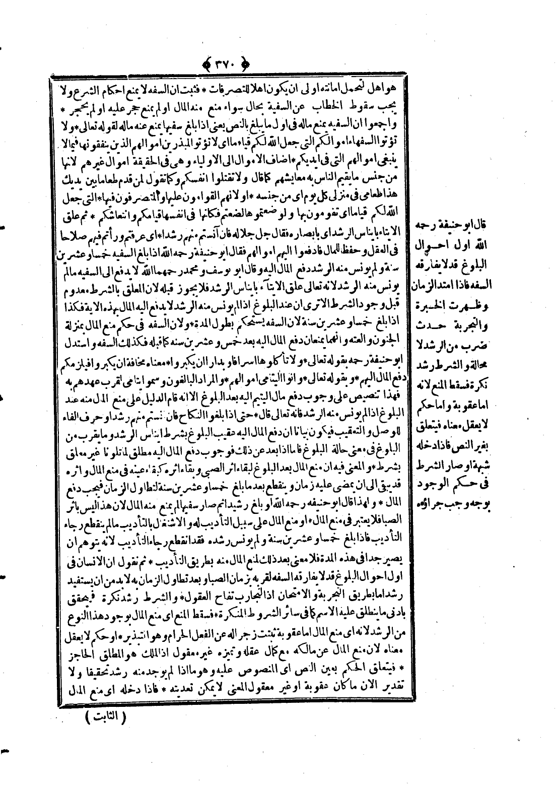 ـــــــــــــــــــــــــــــQهُوَ أَهْلٌ لِتَحَمُّلِ أَمَانَتِهِ أَوْلَى أَنْ يَكُونَ أَهْلًا لِلتَّصَرُّفَاتِ فَثَبَتَ أَنَّ السَّفَهَ لَا يَمْنَعُ أَحْكَامَ الشَّرْعِ وَلَا يَجِبُ سُقُوطُ الْخِطَابِ عَنْ السَّفِيهِ بِحَالٍ سَوَاءٌ مُنِعَ مِنْهُ الْمَالُ أَوْ لَمْ يُمْنَعْ حُجِرَ عَلَيْهِ أَوْ لَمْ يُحْجَرْ وَأَجْمَعُوا أَنَّ السَّفِيهَ يُمْنَعُ مَالُهُ فِي أَوَّلِ مَا يَبْلُغُ بِالنَّصِّ يَعْنِي إذَا بَلَغَ سَفِيهًا يُمْنَعُ عَنْهُ مَالُهُ لِقَوْلِهِ تَعَالَى {وَلا تُؤْتُوا السُّفَهَاءَ أَمْوَالَكُمُ الَّتِي جَعَلَ اللَّهُ لَكُمْ قِيَامًا} [النساء: 5] أَيْ لَا تُؤْتُوا الْمُبَذِّرِينَ أَمْوَالَكُمْ الَّذِينَ يُنْفِقُونَهَا فِيمَا لَا يَنْبَغِي أَمْوَالُهُمْ الَّتِي فِي أَيْدِيكُمْ أَضَافَ الْأَمْوَالَ إلَى الْأَوْلِيَاءِ وَهِيَ فِي الْحَقِيقَةِ أَمْوَالُ غَيْرِهِمْ؛ لِأَنَّهَا مِنْ جِنْسِ مَا يُقِيمُ النَّاسُ بِهِ مَعَايِشَهُمْ كَمَا قَالَ {وَلا تَقْتُلُوا أَنْفُسَكُمْ} [النساء: 29] وَكَمَا تَقُولُ لِمَنْ قَدَّمَ طَعَامًا بَيْنَ يَدَيْك هَذَا طَعَامِي فِي مَنْزِلِي كُلَّ يَوْمٍ أَيْ مِنْ جِنْسِهِ أَوْ لِأَنَّهُمْ الْقَوَّامُونَ عَلَيْهَا وَالْمُتَصَرِّفُونَ فِيهَا {الَّتِي جَعَلَ اللَّهُ لَكُمْ قِيَامًا} [النساء: 5] أَيْ تَقُومُونَ بِهَا وَلَوْ ضَيَّعْتُمُوهَا لَضِعْتُمْ فَكَأَنَّهَا فِي أَنْفُسِهَا قِيَامُكُمْ وَانْتِعَاشُكُمْ ثُمَّ عَلَّقَ الْإِيتَاءَ بِإِينَاسِ الرُّشْدِ أَيْ بِإِبْصَارِهِ فَقَالَ جَلَّ جَلَالُهُ {فَإِنْ آنَسْتُمْ مِنْهُمْ رُشْدًا} [النساء: 6] أَيْ عَرَفْتُمْ وَرَأَيْتُمْ فِيهِمْ صَلَاحًا فِي الْعَقْلِ وَحِفْظًا لِلْمَالِ {فَادْفَعُوا إِلَيْهِمْ أَمْوَالَهُمْ} [النساء: 6] فَقَالَ أَبُو حَنِيفَةَ - رَحِمَهُ اللَّهُ - إذَا بَلَغَ السَّفِيهُ خَمْسًا وَعِشْرِينَ سَنَةً وَلَمْ يُؤْنَسْ مِنْهُ الرُّشْدُ دُفِعَ الْمَالُ إلَيْهِ وَقَالَ أَبُو يُوسُفَ وَمُحَمَّدٌ رَحِمَهُمَا اللَّهُ لَا يُدْفَعُ إلَى السَّفِيهِ مَا لَمْ يُؤْنَسْ مِنْهُ الرُّشْدُ؛ لِأَنَّهُ تَعَالَى عَلَّقَ الْإِيتَاءَ بِإِينَاسِ الرُّشْدِ فَلَا يَجُوزُ قَبْلَهُ؛ لِأَنَّ الْمُعَلَّقَ بِالشَّرْطِ مَعْدُومٌ قَبْلَ وُجُودِ الشَّرْطِ، أَلَا تَرَى أَنَّ عِنْدَ الْبُلُوغِ إذَا لَمْ يُؤْنَسْ مِنْهُ الرُّشْدُ لَا يُدْفَعُ إلَيْهِ الْمَالُ بِهَذِهِ الْآيَةِ فَكَذَا إذَا بَلَغَ خَمْسًا وَعِشْرِينَ سَنَةً؛ لِأَنَّ السَّفَهَ يَسْتَحْكِمُ بِطُولِ الْمُدَّةِ.