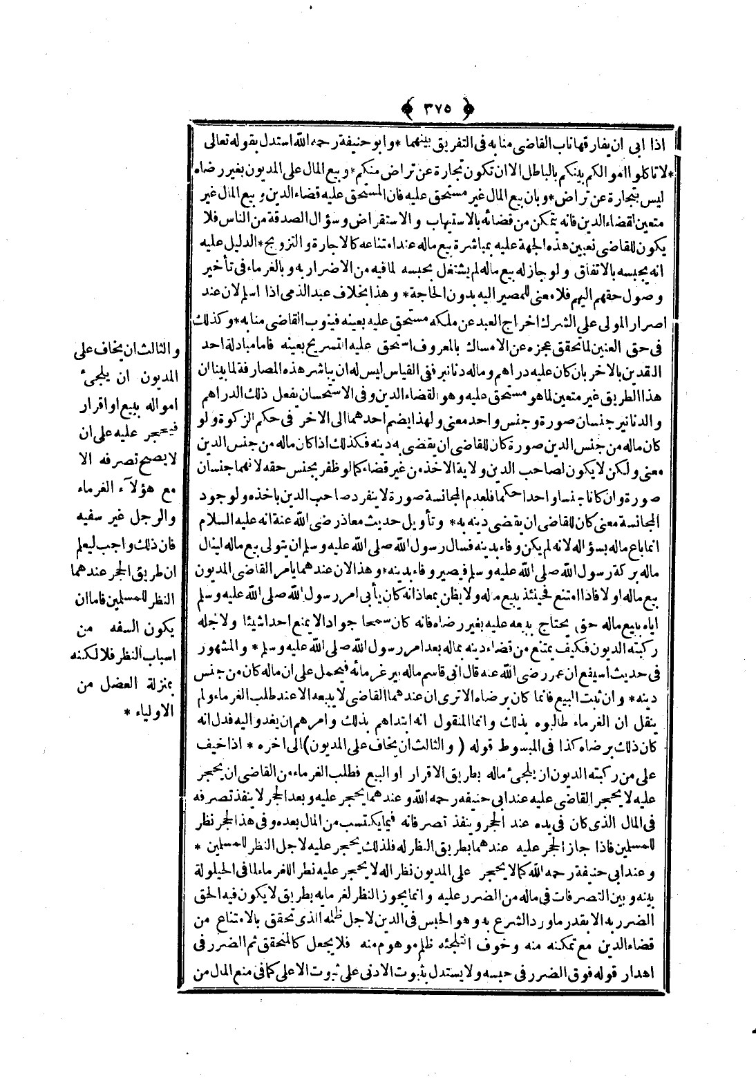 وَالثَّالِثُ أَنْ يَخَافَ عَلَى الْمَدْيُونِ أَنْ يُلْجِئَ أَمْوَالَهُ بِبَيْعٍ أَوْ إقْرَارٍ فَيَحْجُرَ عَلَيْهِ عَلَى أَنْ يَصِحَّ تَصَرُّفُهُ إلَّا مَعَ هَؤُلَاءِ الْغُرَمَاءِ وَالرَّجُلُ غَيْرُ سَفِيهٍ فَإِنَّ ذَلِكَ وَاجِبٌ لِيُعْلَمَ أَنَّ طَرِيقَ الْحَجْرِ عِنْدَهُمَا النَّظَرُ لِلْمُسْلِمِينَ فَأَمَّا أَنْ يَكُونَ السَّفَهُ مِنْ أَسْبَابِ النَّظَرِ فَلَا لَكِنَّهُ بِمَنْزِلَةِ الْعَضْلِ مِنْ الْأَوْلِيَاءِ.