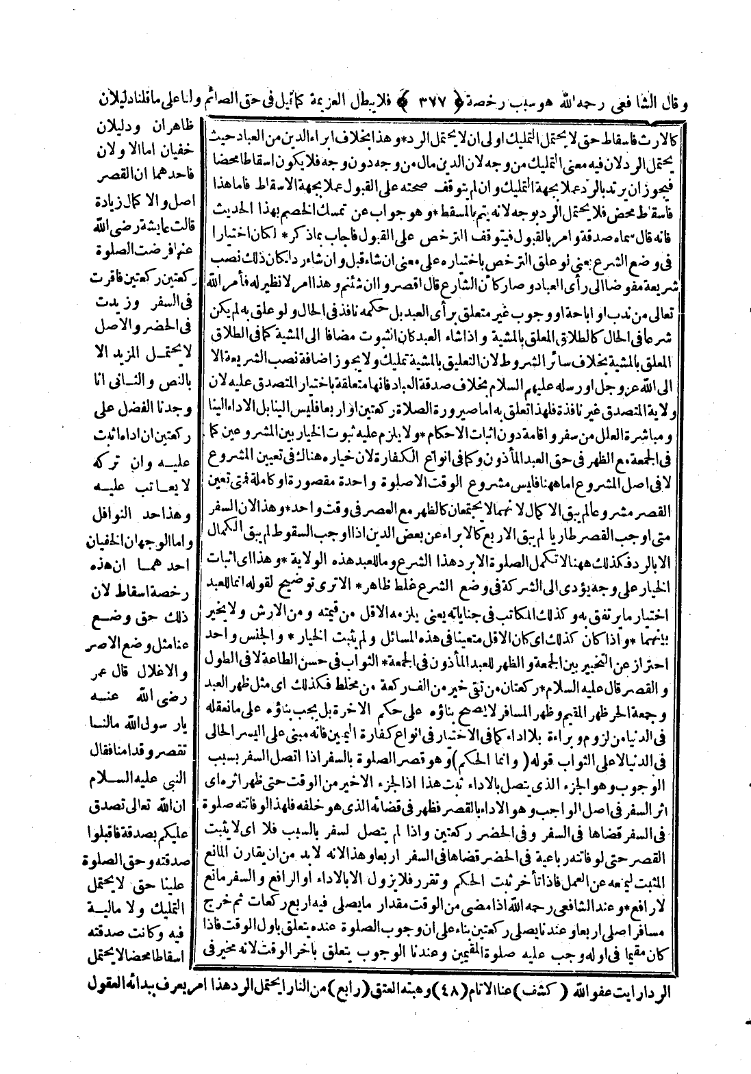 وَأَمَّا الْوَجْهَانِ الْخَفِيَّانِ أَحَدُهُمَا أَنَّ هَذِهِ رُخْصَةُ إسْقَاطٍ؛ لِأَنَّ ذَلِكَ حَقٌّ وُضِعَ عَنَّا مِثْلُ وَضْعِ الْإِصْرِ وَالْأَغْلَالِ، «قَالَ عُمَرُ - رَضِيَ اللَّهُ عَنْهُ - يَا رَسُولَ اللَّهِ مَالَنَا نَقْصُرُ وَقَدْ أَمِنَّا فَقَالَ النَّبِيُّ - عَلَيْهِ السَّلَامُ - إنَّ اللَّهَ تَعَالَى تَصَدَّقَ عَلَيْكُمْ بِصَدَقَةٍ فَاقْبَلُوا صَدَقَتَهُ» وَحَقُّ الصَّلَاةِ عَلَيْنَا حَقٌّ لَا يَحْتَمِلُ التَّمْلِيكَ وَلَا مَالِيَّةَ فِيهِ وَكَانَتْ صَدَقَتُهُ إسْقَاطًا مَحْضًا لَا يَحْتَمِلُ الرَّدَّ أَرَأَيْت عَفْوَ اللَّهِ عَنَّا إلَّا تَامًّا وَهِبَتَهُ الْعِتْقَ مِنْ النَّارِ أَيَحْتَمِلُ الرَّدَّ هَذَا أَمْرٌ يُعْرَفُ بِبُدَاءَةِ الْعُقُولِ
