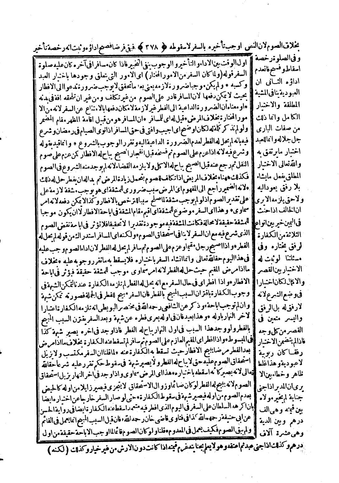 بِخِلَافِ الصَّوْمِ؛ لِأَنَّ النَّصَّ أَوْجَبَ تَأْخِيرَهُ بِالسَّفَرِ لَا سُقُوطَهُ فَبَقِيَ فَرْضًا فَصَحَّ أَدَاؤُهُ وَثَبَتَ أَنَّهُ رُخْصَةُ تَأْخِيرٍ وَفِي الصَّلَاةِ رُخْصَةُ إسْقَاطٍ وَفَسْخٍ فَانْعَدَمَ أَدَاؤُهُ الثَّانِي أَنَّ الْعُبُودِيَّةَ تُنَافِي الْمَشِيئَةَ الْمُطْلَقَةَ وَالِاخْتِيَارَ الْكَامِلَ وَإِنَّمَا ذَلِكَ مِنْ صِفَاتِ الْبَارِّ جَلَّ جَلَالُهُ وَإِنَّمَا لِلْعَبْدِ اخْتِيَارُ مَا يَرْتَفِقُ بِهِ وَلِلَّهِ تَعَالَى الِاخْتِيَارُ الْمُطْلَقُ يَفْعَلُ مَا يَشَاءُ بِلَا رِفْقٍ يَعُودُ إلَيْهِ وَلَا حَقَّ يَلْزَمُهُ.