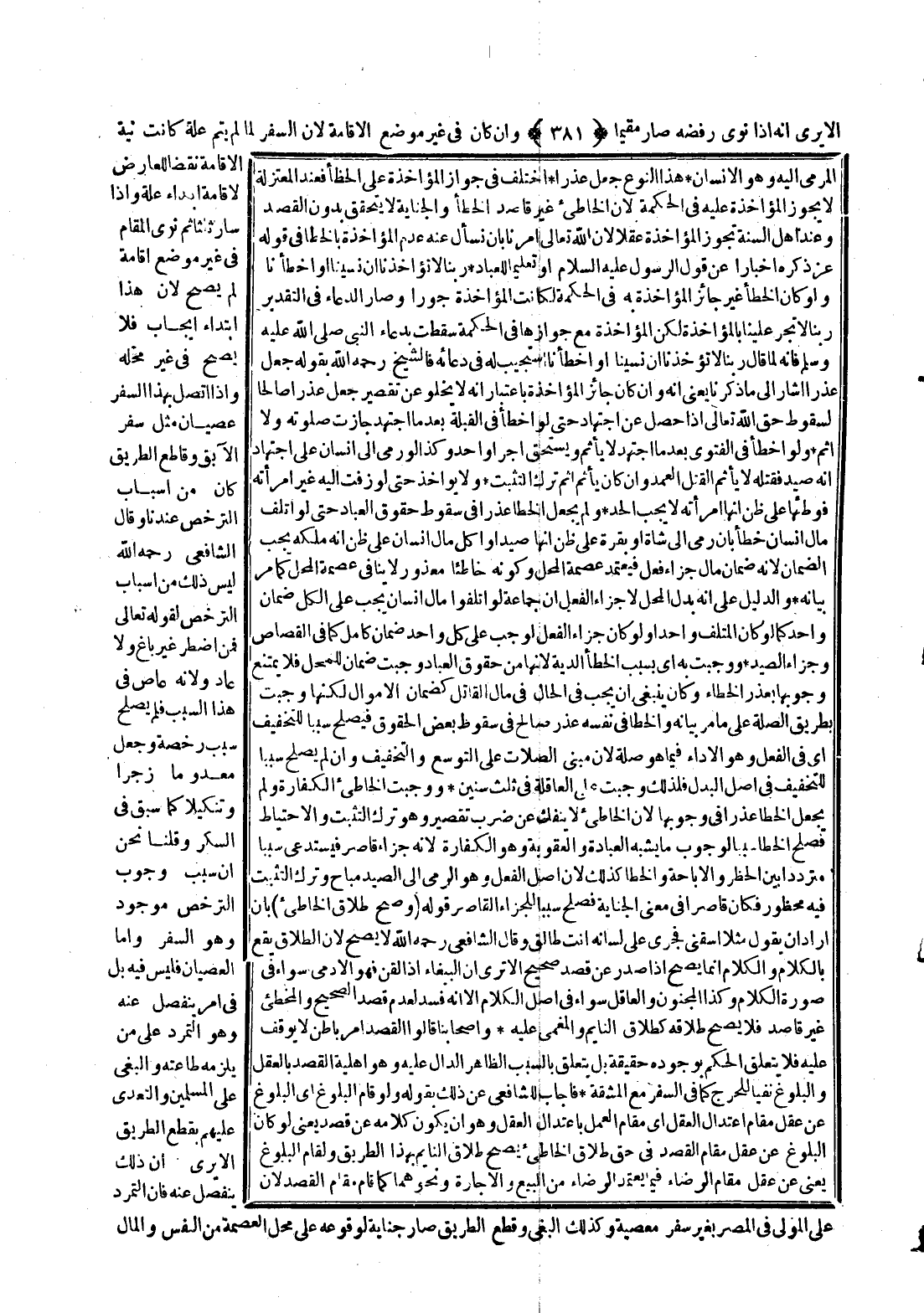 أَلَا تَرَى أَنَّهُ إذَا نَوَى رَفْضَهُ صَارَ مُقِيمًا وَإِنْ كَانَ فِي غَيْرِ مَوْضِعِ الْإِقَامَةِ؛ لِأَنَّ السَّفَرَ لَمَّا لَمْ يُتِمَّ عِلَّةً كَانَتْ نِيَّةُ الْإِقَامَةِ نَقْضًا لِلْعَارِضِ لِإِقَامَةِ ابْتِدَاءِ عِلَّةٍ وَإِذَا سَارَ ثُلُثًا ثُمَّ نَوَى الْمُقَامَ فِي غَيْرِ مَوْضِعِ إقَامَةٍ لَمْ يَصِحَّ؛ لِأَنَّ هَذَا ابْتِدَاءُ إيجَابٍ فَلَا يَصِحُّ فِي غَيْرِ مَحَلِّهِ وَإِذَا اتَّصَلَ بِهَذَا السَّفَرِ عِصْيَانٌ مِثْلُ سَفَرِ الْآبِقِ وَقَاطِعُ الطَّرِيقِ كَانَ مِنْ أَسْبَابِ التَّرَخُّصِ عِنْدَنَا وَقَالَ الشَّافِعِيُّ - رَحِمَهُ اللَّهُ - لَيْسَ ذَلِكَ مِنْ أَسْبَابِ التَّرَخُّصِ لِقَوْلِهِ تَعَالَى {فَمَنِ اضْطُرَّ غَيْرَ بَاغٍ وَلا عَادٍ} [البقرة: 173] وَلِأَنَّهُ عَاصٍ فِي هَذَا السَّبَبِ فَلَمْ يَصْلُحْ سَبَبَ رُخْصَةٍ وَجُعِلَ مَعْدُومًا زَجْرًا وَتَنْكِيلًا كَمَا سَبَقَ فِي السُّكْرِ وَقُلْنَا نَحْنُ إنَّ سَبَبَ وُجُوبِ التَّرَخُّصِ مَوْجُودٌ وَهُوَ السَّفَرُ.