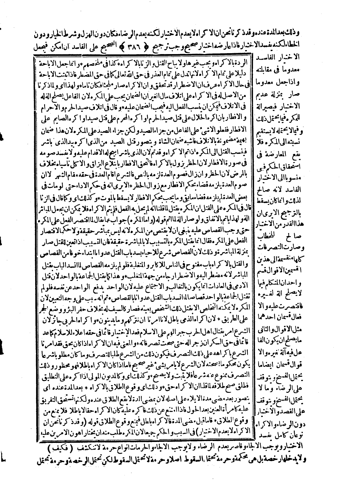 نَوْعَانِ كَامِلٌ يُفْسِدُ الِاخْتِيَارَ وَيُوجِبُ الْإِلْجَاءَ وَقَاصِرٌ يَعْدَمُ الرِّضَا وَلَا يُوجِبُ الْإِلْجَاءَ وَالْحُرُمَاتُ أَنْوَاعٌ حُرْمَةٌ لَا تَنْكَشِفُ وَلَا يَدْخُلُهَا رُخْصَةٌ بَلْ هِيَ مُحْكَمَةٌ وَحُرْمَةٌ تَحْتَمِلُ السُّقُوطَ أَصْلًا وَحُرْمَةٌ لَا تَحْتَمِلُ السُّقُوطَ لَكِنْ تَحْتَمِلُ الرُّخْصَةَ وَحُرْمَةٌ تَحْتَمِلُ