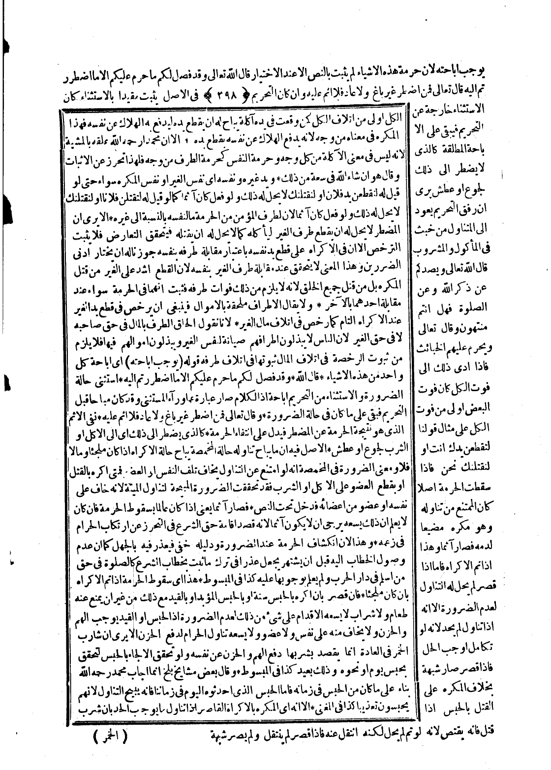 يُوجِبُ إبَاحَتَهُ؛ لِأَنَّ حُرْمَةَ هَذِهِ الْأَشْيَاءِ لَمْ يَثْبُتْ بِالنَّصِّ إلَّا عِنْدَ الِاخْتِيَارِ قَالَ اللَّهُ تَعَالَى {وَقَدْ فَصَّلَ لَكُمْ مَا حَرَّمَ عَلَيْكُمْ إِلا مَا اضْطُرِرْتُمْ إِلَيْهِ} [الأنعام: 119] قَالَ تَعَالَى {فَمَنِ اضْطُرَّ غَيْرَ بَاغٍ وَلا عَادٍ فَلا إِثْمَ عَلَيْهِ} [البقرة: 173] وَإِنْ كَانَ التَّحْرِيمُ فِي الْأَصْلِ يَثْبُتُ مُقَيَّدًا بِالِاسْتِثْنَاءِ كَانَ الِاسْتِثْنَاءُ خَارِجَةً عَنْ التَّحْرِيمِ فَيَبْقَى عَلَى الْإِبَاحَةِ الْمُطْلَقَةِ كَاَلَّذِي لَا يَضْطَرُّ إلَى ذَلِكَ لِجُوعٍ أَوْ عَطَشٍ يَرَى أَنَّ رِفْقَ التَّحْرِيمِ يَعُودُ إلَى الْمُتَنَاوَلِ مِنْ خُبْثٍ فِي الْمَأْكُولِ وَالْمَشْرُوبِ قَالَ اللَّهُ تَعَالَى {وَيَصُدَّكُمْ عَنْ ذِكْرِ اللَّهِ وَعَنِ الصَّلاةِ فَهَلْ أَنْتُمْ مُنْتَهُونَ} [المائدة: 91] .