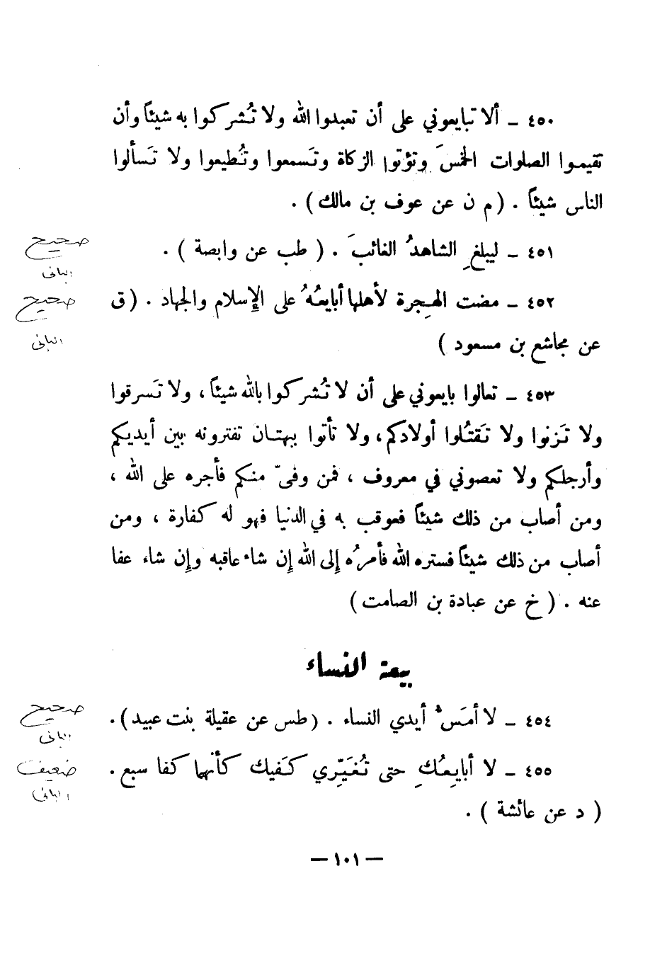 450 – "ألا تبايعوني على أن تعبدوا الله ولا تشركوا به شيئا وأن تقيموا الصلوات الخمس وتؤتوا الزكاة وتسمعوا وتطيعوا ولا تسألوا الناس شيئا". (م ن عن عوف بن مالك) .