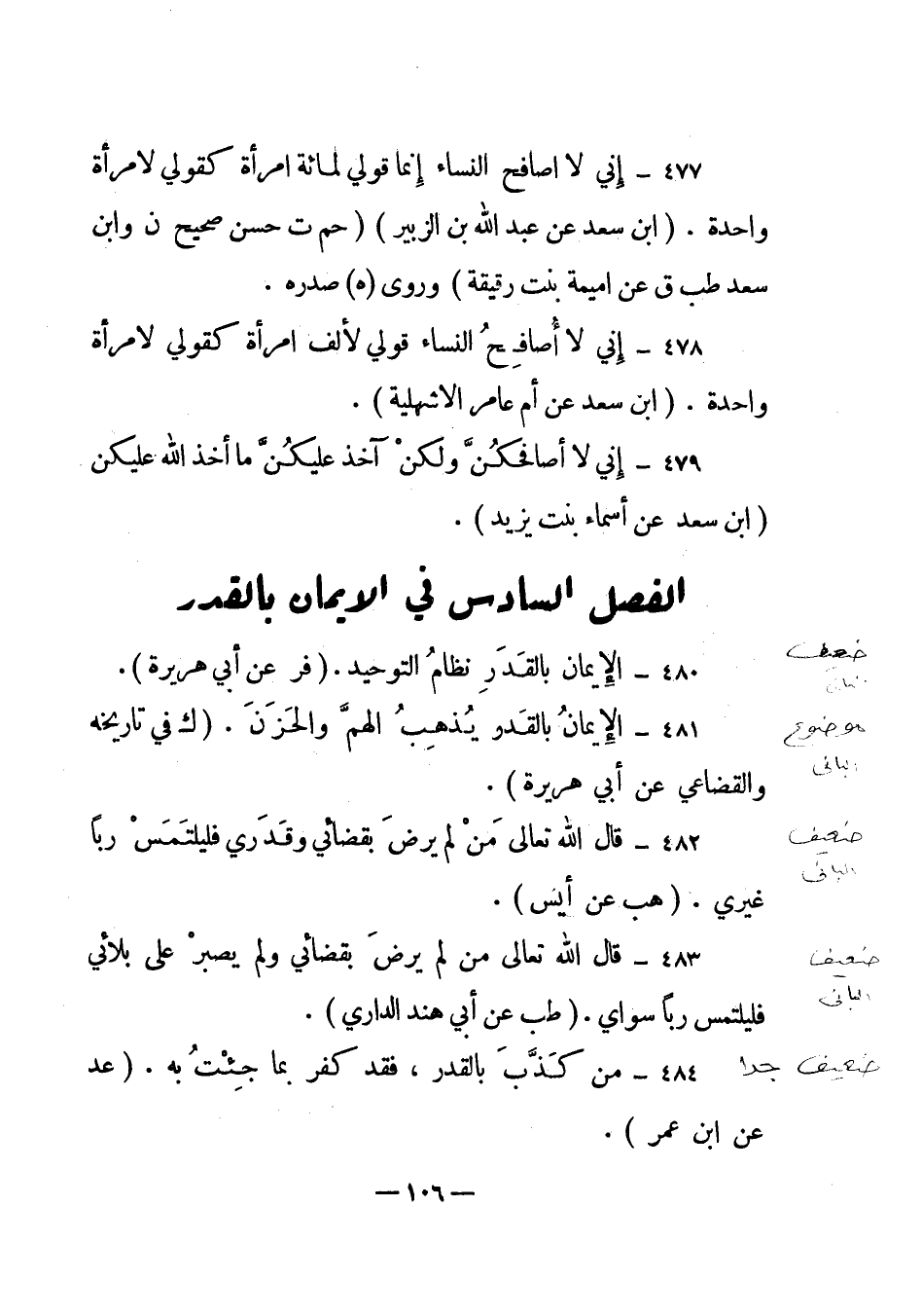 484 – "من كذب بالقدر، فقد كفر بما جئت به". (عد عن ابن عمر) .