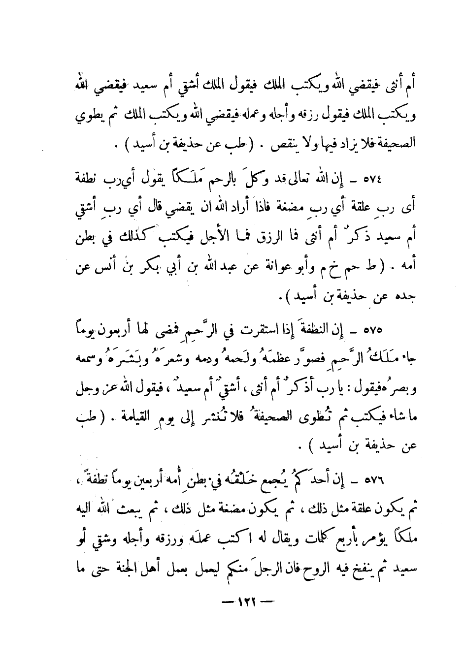 574 – " إن الله تعال قد وكل بالرحم ملكا يقول أي رب نطفة أي رب علقة أي رب مضغة فإذا أراد الله أن يقضي قال أي رب أشقي أم سعيد ذكر أم أنثى فما الرزق فما الأجل فيكتب كذلك في بطن أمه". (ط حم خ م وأبوعوانة عن عبد الله بن أبي بكر بن أنس عن جده عن حذيفة بن أسيد) .