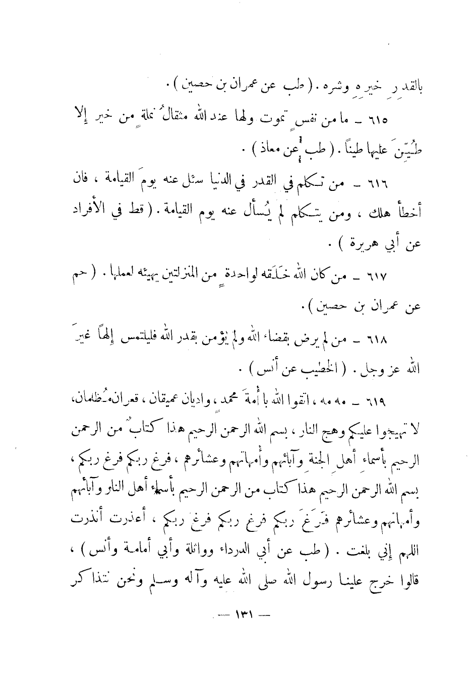 616 – " من تكلم في القدر في الدنيا سئل عنه يوم القيامة، فإن أخطأ هلك، ومن يتكلم لم يسأل عنه يوم القيامة". (قط في الأفراد عن أبي هريرة) .