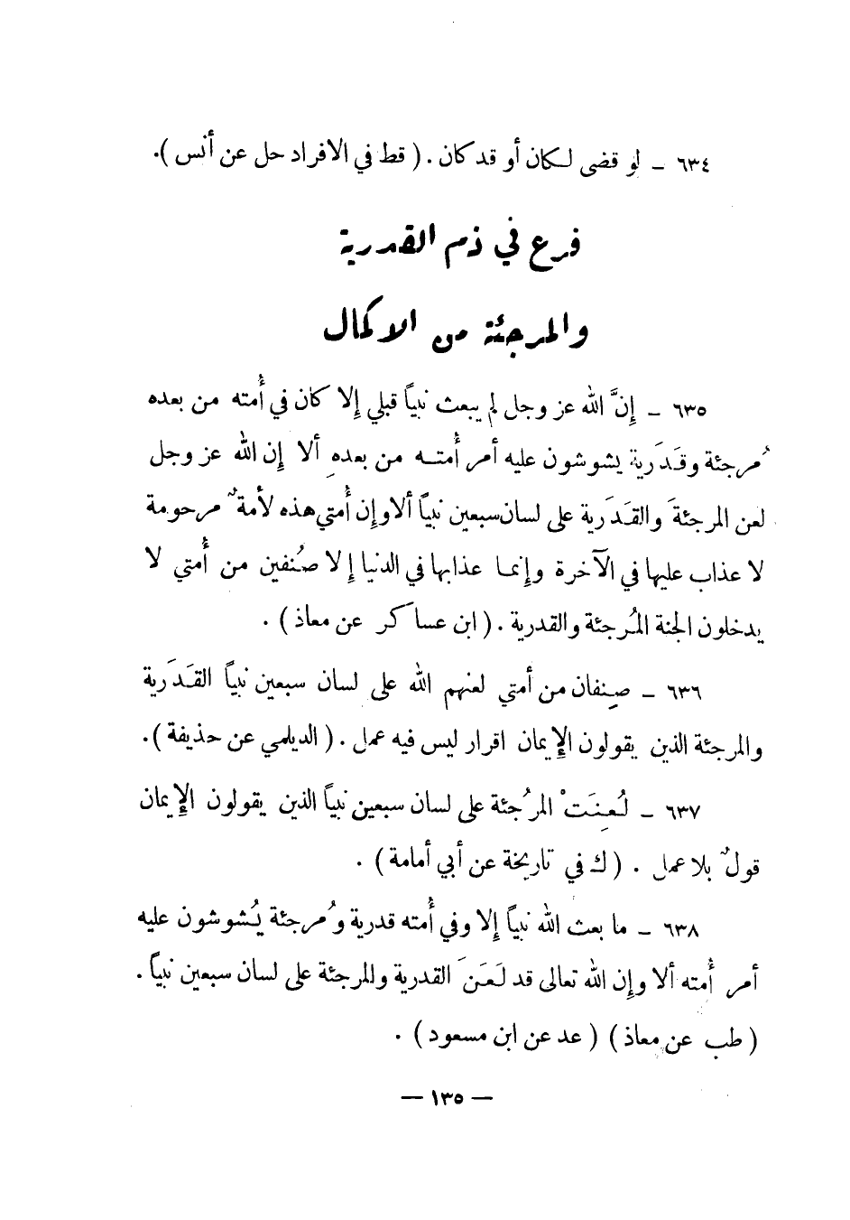 638 – "ما بعث الله نبيا إلا وفي أمته قدرية ومرجئة يشوشون عليه أمر أمته ألا وإن الله تعالى قد لعن القدرية والمرجئة على لسان سبعين نبيا". (طب عن معاذ) (عد عن ابن مسعود) .