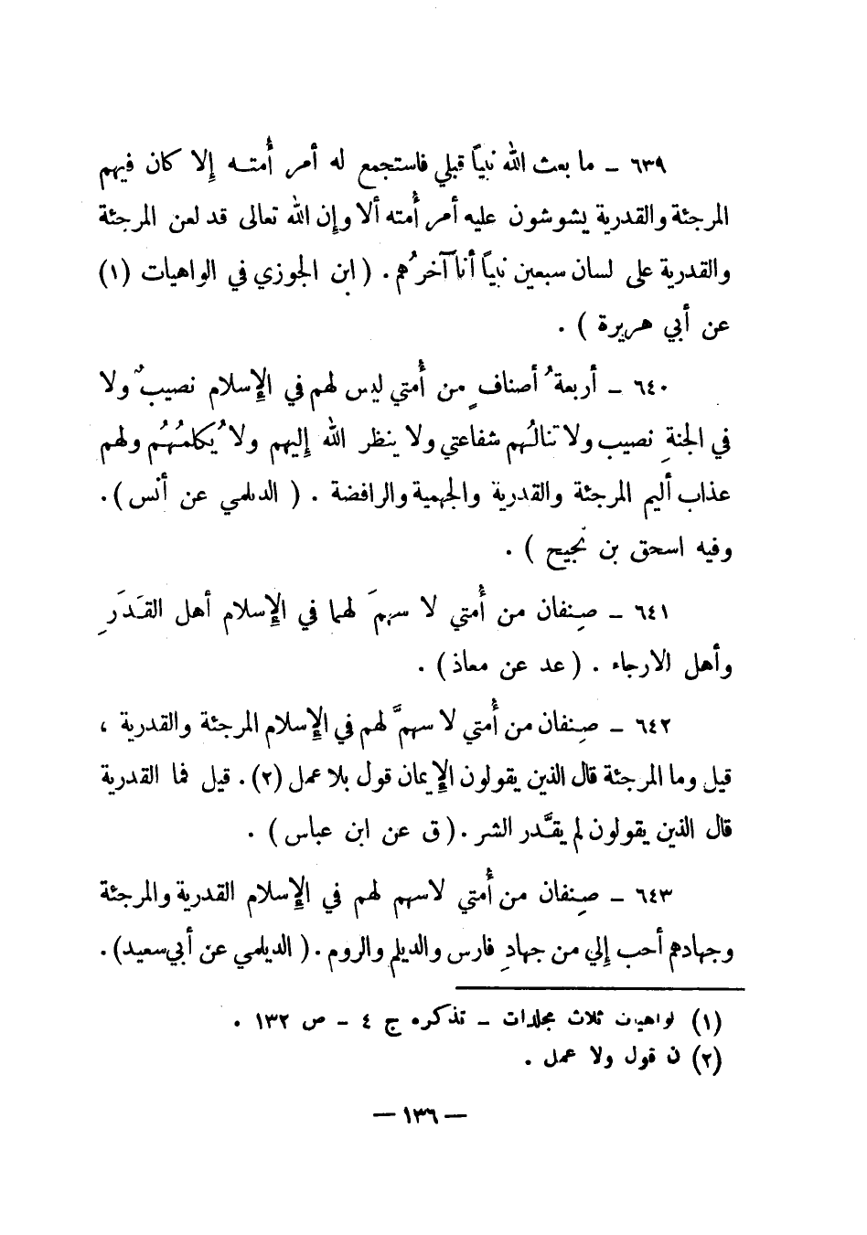 642 – "صنفان من أمتي لا سهم لهم في الإسلام المرجئة والقدرية، قيل وما المرجئة قال الذين يقولون الإيمان قول بلا عمل (2)) . قيل فما القدرية قال الذين يقولون لم يقدر الشر". (ق عن ابن عباس) .