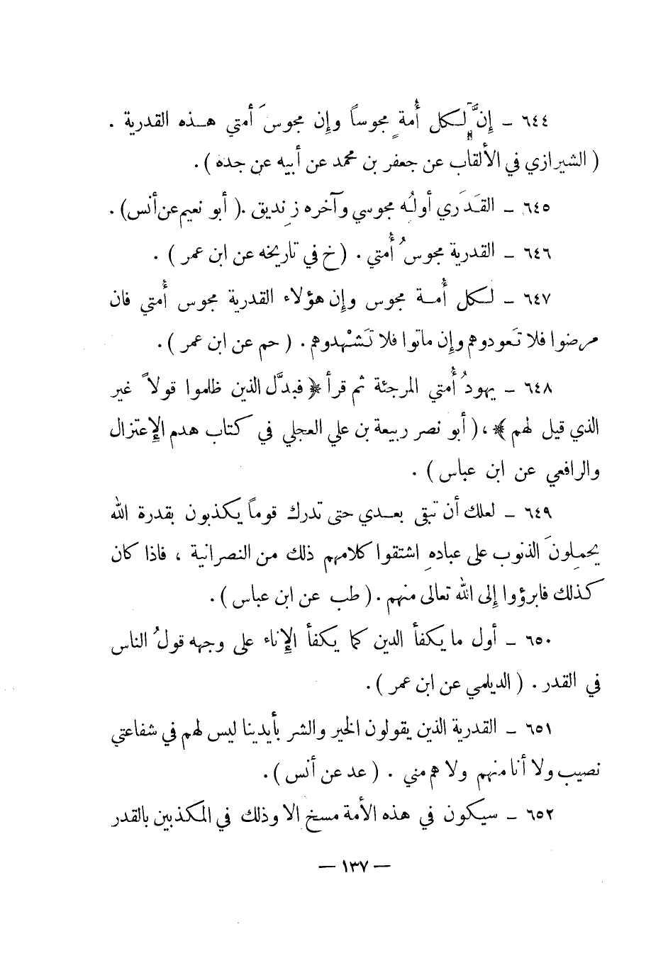 644 – "إن لكل أمة مجوسا وإن مجوس أمتي هذه القدرية". (الشيرازي في الألقاب عن جعفر بن محمد عن أبيه عن جده) .