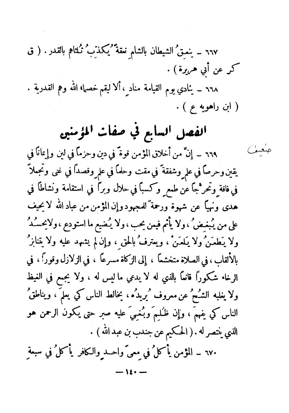 669 – "إن من أخلاق المؤمن قوة في دين وحزم في لين وإيمانا في يقين وحرصا في علم وشفقة في مقت وحلما في علم وقصدا في غنى وتجملا في فاقة وتحرجا عن طمع وكسبا في حلال وبرا في استقامة ونشاطا في هدى ونهيا عن شهوة ورحمة للمجهود وإن المؤمن من عباد الله لا يحيف على من يبغض، ولا يأثم فيمن يحب، ولا يضيع ما استودع، ولا يحسد ولا يطعن ولا يلعن، ويعترف بالحق، وإن لم يشهد عليه ولا يتنابز بالألقاب، في الصلاة متخشعا، إلى الزكاة مسرعا، في الزلازل وقورا، في الرخاء شكورا قانعا بالذي له لا يدعي ما ليس له، ولا يجمع في الغيظ ولا يغلبه الشح عن معروف يريده، يخالط الناس كي يعلم، ويناطق الناس كي يفهم، وإن ظلم وبغي عليه صبر حتى يكون الرحمن هو الذي ينتصر له". (الحكيم عن جندب بن عبد الله) .