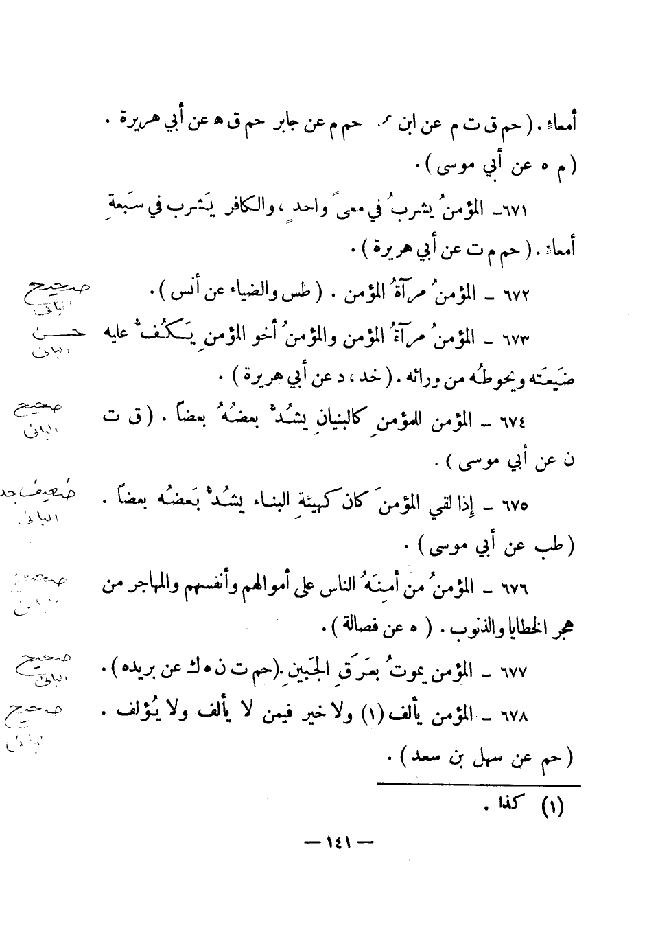 673 – "المؤمن مرآة المؤمن والمؤمن أخو المؤمن يكف عليه ضيعته ويحوطه من ورائه ". (خد، د عن أبي هريرة) .