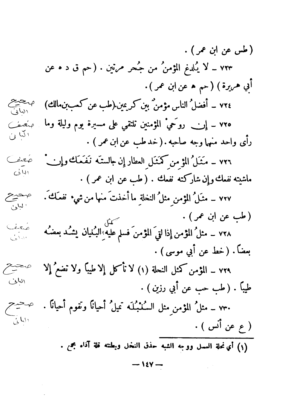 729 - " المؤمن كمثل النحلة (1) لا تأكل إلا طيبا ولا تضع إلا طيبا". (طب حب عن أبي رزين) .