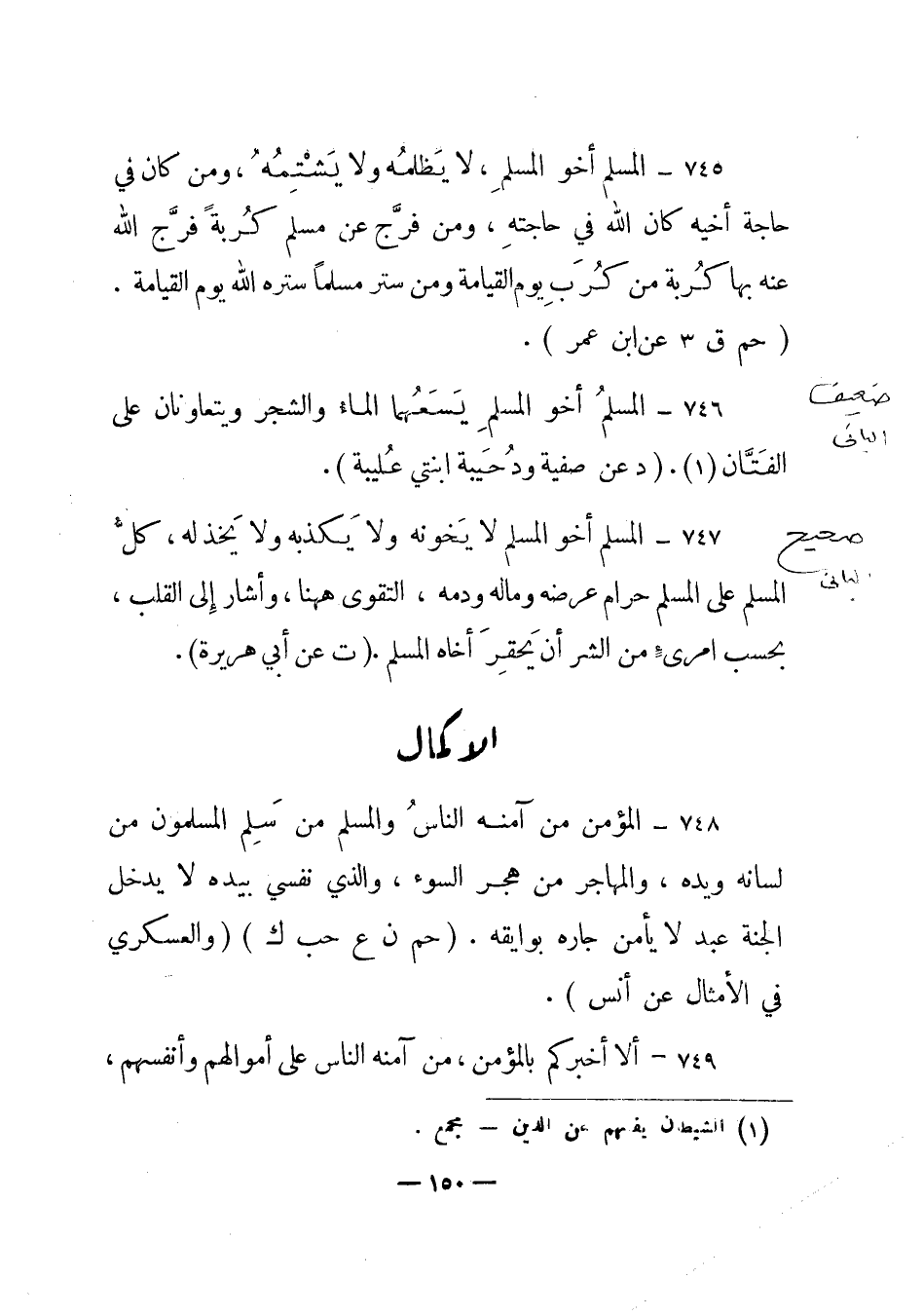 745 – "المسلم أخو المسلم، لا يظلمه ولا يشتمه، ومن كان في حاجة أخيه كان الله في حاجته، ومن فرج عن مسلم كربة فرج الله عنه بها كربة من كرب يوم القيامة ومن ستر مسلما ستره الله يوم القيامة". (حم ق 3 عن ابن عمر) .