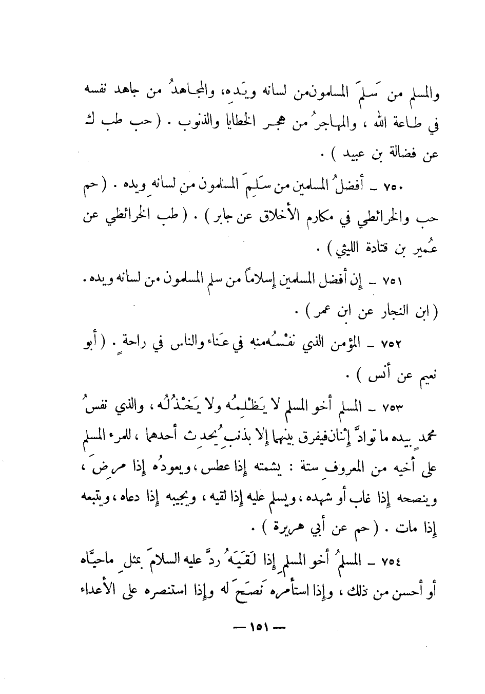 750 – "أفضل المسلمين من سلم المسلمون من لسانه ويده". (حم حب والخرائطي في مكارم الأخلاق عن جابر) . (طب الخرائطي عن عمير بن قتادة الليثي) .