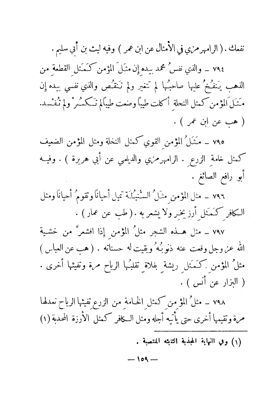 798 – "مثل المؤمن كمثل الخامة من الزرع تفيئها الرياح تعدلها مرة وتقيمها أخرى حتى يأتيه أجله ومثل الكافر كمثل الأرزة المحدبة (1)