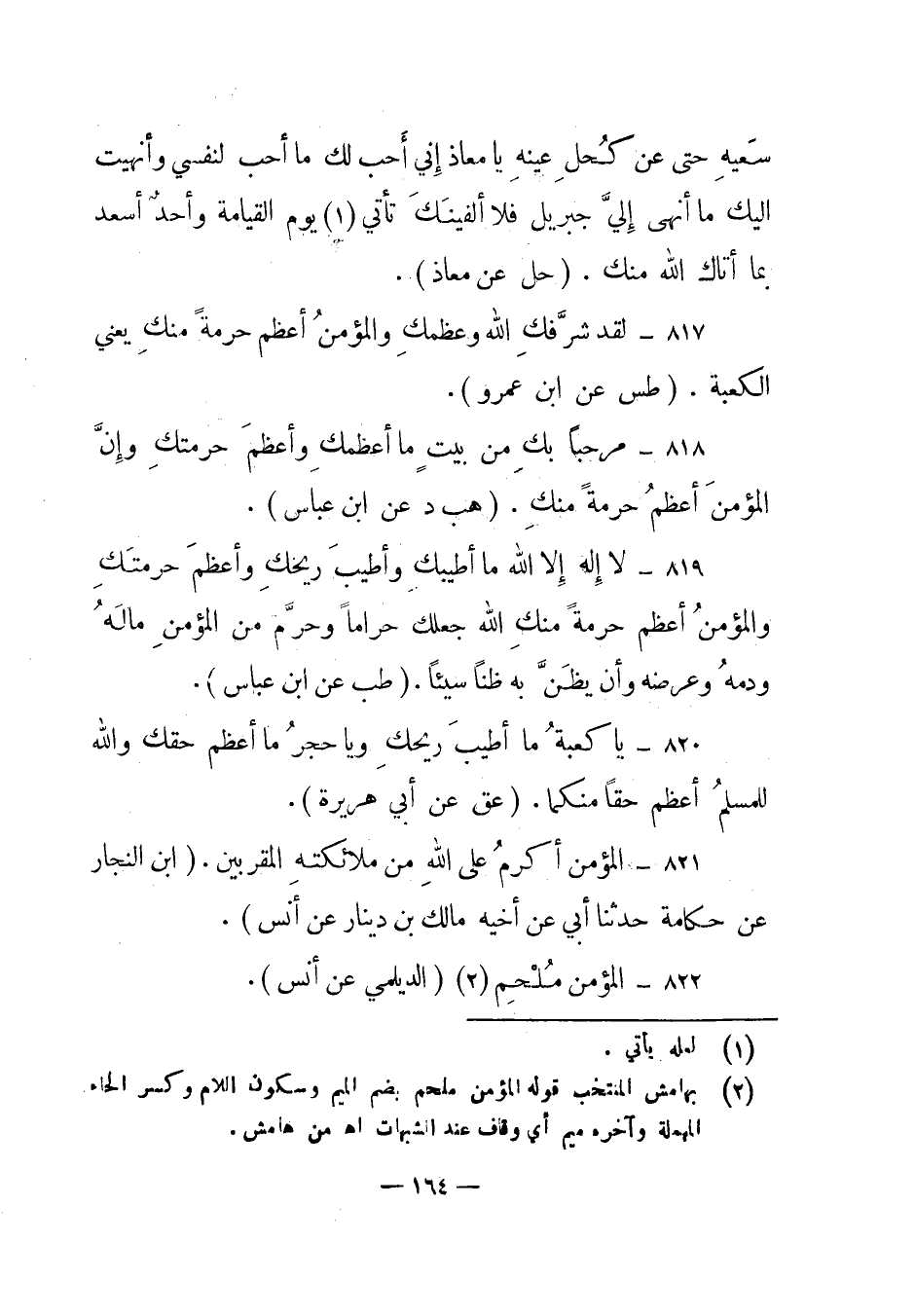820 – "يا كعبة ما أطيب ريحك ويا حجر ما أعظم حقك والله للمسلم أعظم حقا منكما". (عق عن أبي هريرة) .