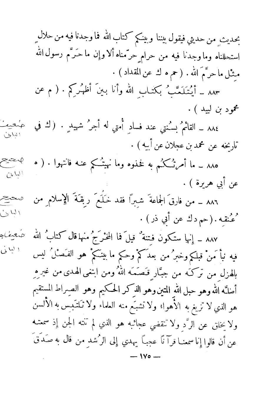 887 – "إنها ستكون فتنة قيل فما المخرج منها قال كتاب الله فيه نبأ من قبلكم وخبر من بعدكم وحكم ما بينكم هو الفصل ليس بالهزل من تركه من جبار قصمه الله ومن ابتغى الهدى من غيره أضله الله وهو حبل الله المتين وهو الذكر الحكيم وهو الصراط المستقيم