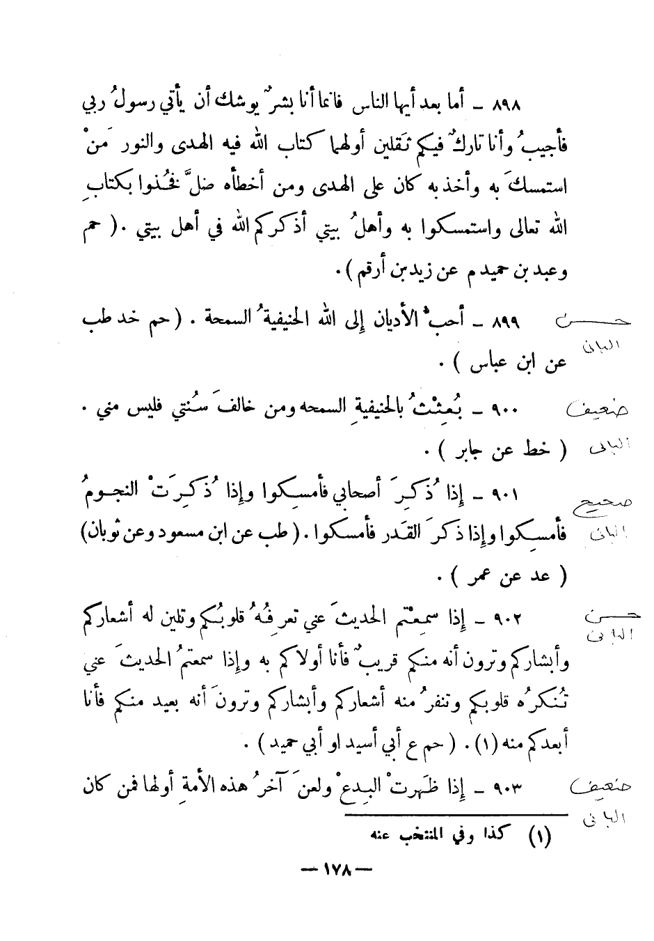 898 – "أما بعد أيها الناس فإنما أنا بشر يوشك أن يأتي رسول ربي فأجيب وأنا تارك فيكم ثقلين أولهما كتاب الله فيه الهدى والنور من استمسك به وأخذ به كان على الهدى ومن أخطأه ضل فخذوا بكتاب الله تعالى واستمسكوا به وأهل بيتي أذكركم الله في أهل بيتي". (حم وعبد بن حميد م عن زيد بن أرقم) .