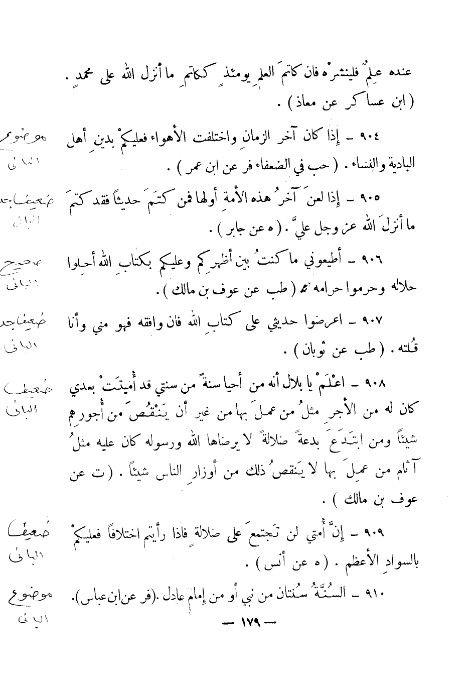 903 – " إذا ظهرت البدع ولعن آخر هذه الأمة أولها فمن كان عنده علم فلينشره فإن كاتم العلم يومئذ ككاتم ما أنزل الله على محمد". (ابن عساكر عن معاذ) .