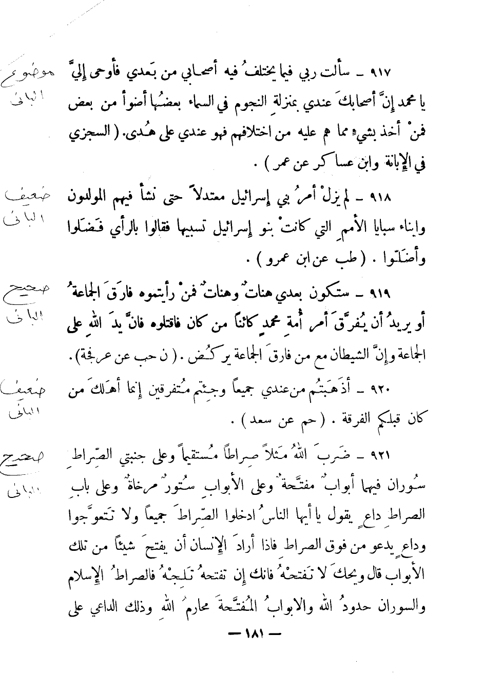 917 – "سألت ربي فيما يختلف فيه أصحابي من بعدي فأوحى إلي يا محمد إن أصحابك عندي بمنزلة النجوم في السماء بعضها أضوأ من بعض فمن أخذ بشيء مما هم عليه من اختلافهم فهو عندي على هدى". (السجزي في الإبانة وابن عساكر عن عمر) .
