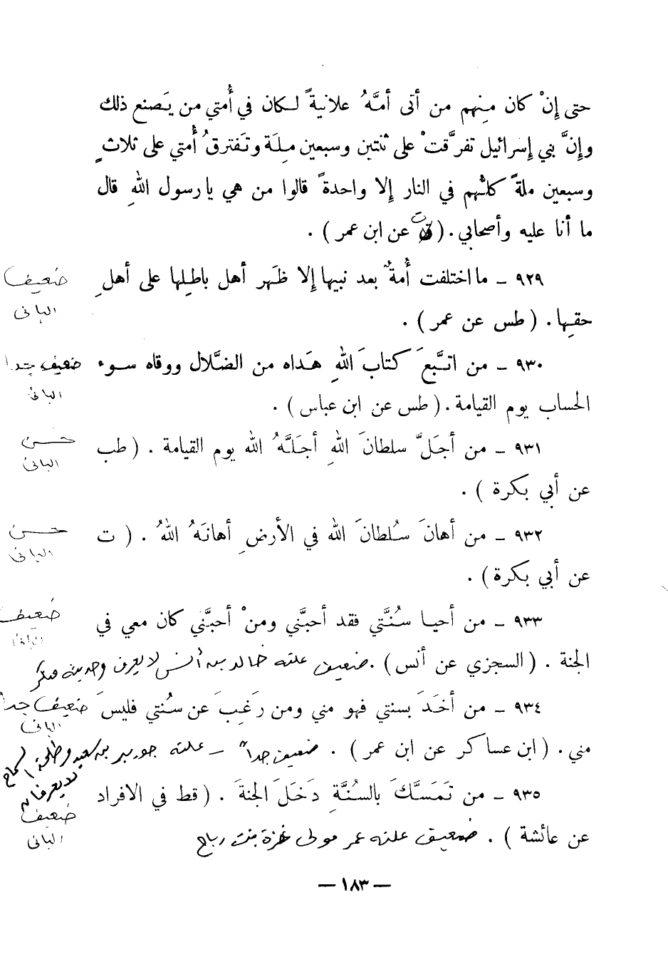928 – "ليأتين على أمتي ما أتى على بني إسرائيل حذو النعل بالنعل حتى إن كان منهم من أتى أمه علانية لكان في أمتي من يصنع ذلك وإن بني إسرائيل تفرقت على ثنتين وسبعين ملة وتفترق أمتي على ثلاث وسبعين ملة كلهم في النار إلا واحدة قالوا من هي يا رسول الله قال ما أنا عليه وأصحابي". (ق عن ابن عمر) .