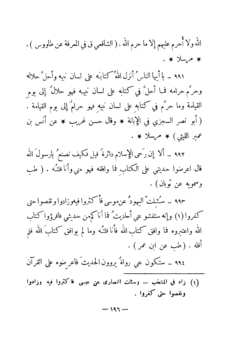 991 – "يا أيها الناس أنزل الله كتابه على لسان نبيه وأحل حلاله وحرم حرامه فما أحل في كتابه على لسان نبيه فهو حلال إلى يوم القيامة وما حرم في كتابه على لسان نبيه فهو حرام إلى يوم القيامة". (أبونصر السجزي في الإبانة وقال حسن غريب عن أنس بن عمير الليثي) مرسلا.