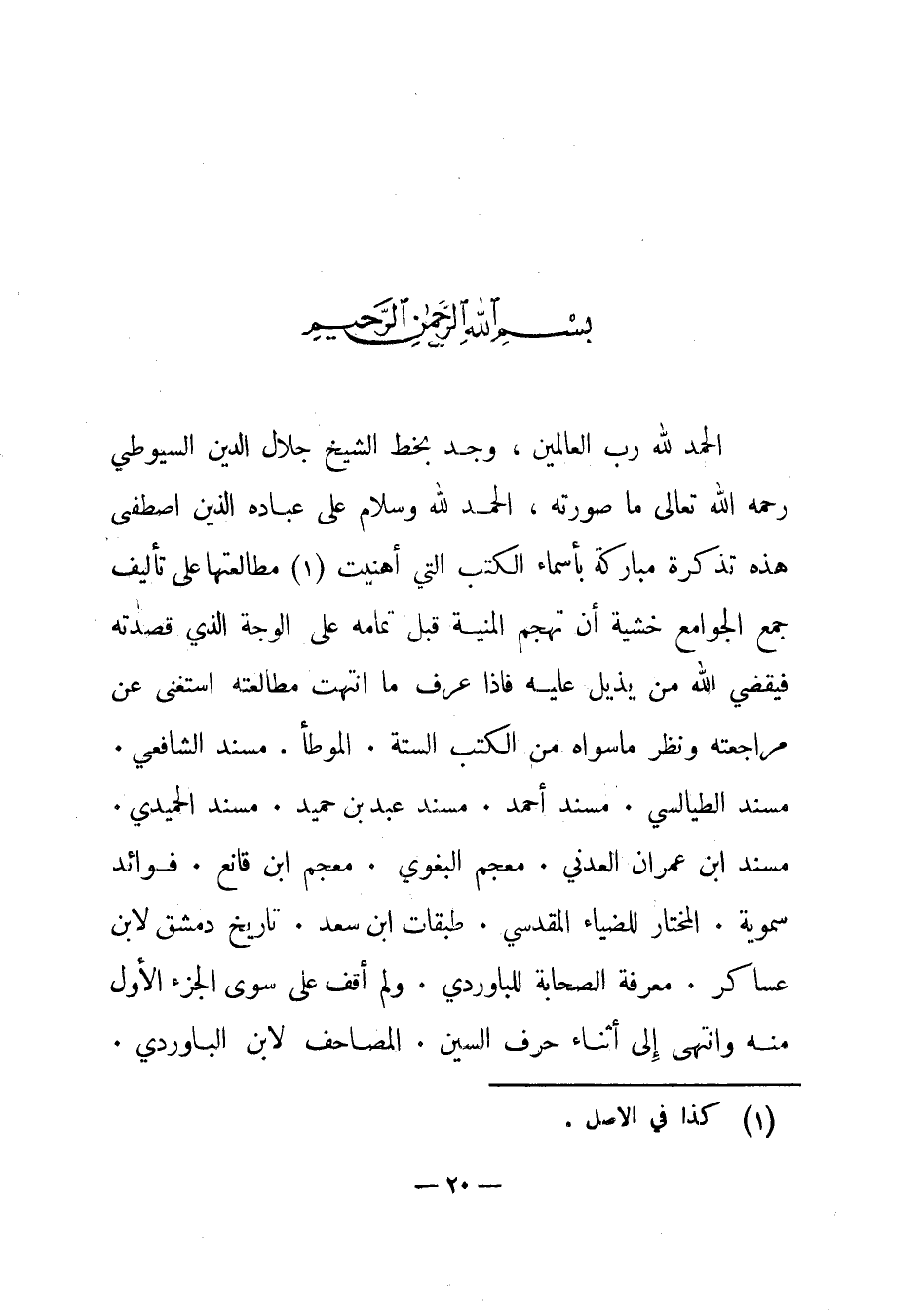 الحمد لله رب العالمين، وجد بخط الشيخ جلال الدين السيوطي رحمه الله تعالى ما صورته: الحمد لله وسلام على عباده الذين اصطفى. هذه تذكرة مباركة بأسماء الكتب التي أهنيت (1) مطالعتها على تأليف جمع الجوامع خشية أن تهجم المنية قبل تمامه على الوجه الذي قصدته فيقضي الله من يذيل عليه فإذا عرف ماانتهت مطالعته استغنى عن مراجعته ونظر ماسواه من الكتب الستة. الموطأ. مسند الشافعي. مسند الطيالسي. مسند أحمد. مسند عبد بن حميد. مسند الحميدي. مسند ابن عمران العدني. معجم البغوي. معجم ابن قانع. فوائد سموية. المختار للضياء المقدسي. طبقات ابن سعد. تاريخ دمشق لابن عساكر. معرفة الصحابة للبارودي. ولم أقف على سوى الجزء الأول منه وانتهى إلى أثناء حرف السين. المصاحف لابن البارودي.