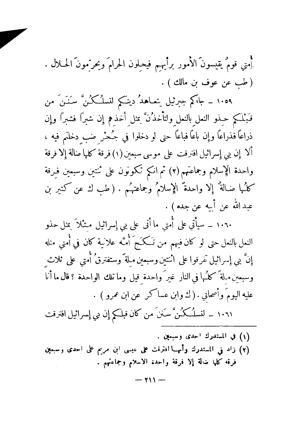 1059 – "جاءكم جبرائيل يتعاهد دينكم لتسلكن سنن من قبلكم حذو النعل بالنعل ولتأخذن بمثل أخذهم إن شبرا فشبرا وإن ذراعا فذراعا وإن باعا فباعا حتى لو دخلوا في جحر ضب دخلتم فيه، ألا إن بني إسرائيل افترقت على موسى سبعين (1) فرقة كلها ضالة إلا فرقة واحدة الإسلام وجماعتهم (2) ثم أنكم تكونون على ثنتين وسبعين فرقة كلها ضالة إلا واحدة الإسلام وجماعتهم". (طب ك عن كثير بن عبد الله عن أبيه عن جده) .