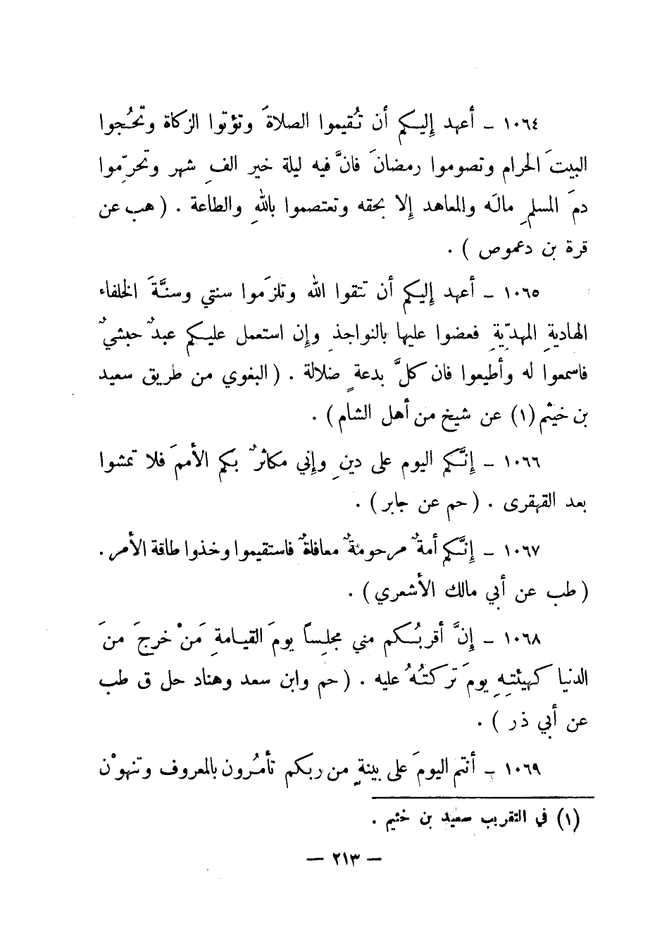 1065 – "أعهد إليكم أن تتقوا الله وتلزموا سنتي وسنة الخلفاء الهادية المهدية فعضوا عليها بالنواجذ وإن استعمل عليكم عبد حبشي فاسمعوا له وأطيعوا فإن كل بدعة ضلالة". (البغوي من طريق سعيد بن خيثم (1) عن شيخ من أهل الشام) .